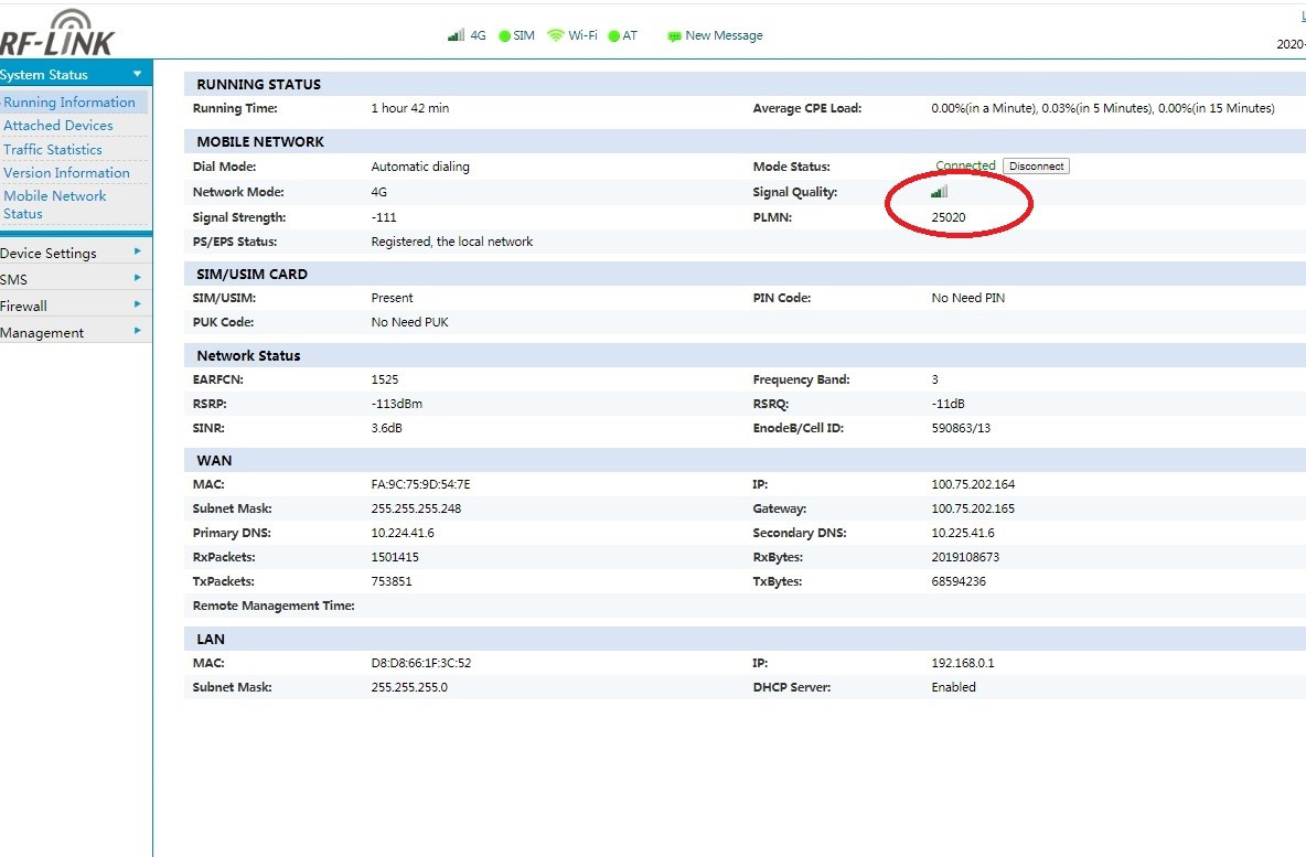 Как видим, появился 4G-прием, что нам и нужно. Красным обозначена шкала уровня сигнала: многим так привычней и можно ориентироваться по аналогии со смартфоном. Я специально не рассказываю про уровни сигнала, отображающегося цифрами в интерфейсе. Мне просто показалось, что они некорректно работают. Я не стал больше разбираться и решил тестировать только на действительной скорости доступа в интернет, пользуясь различными онлайн-сервисами.