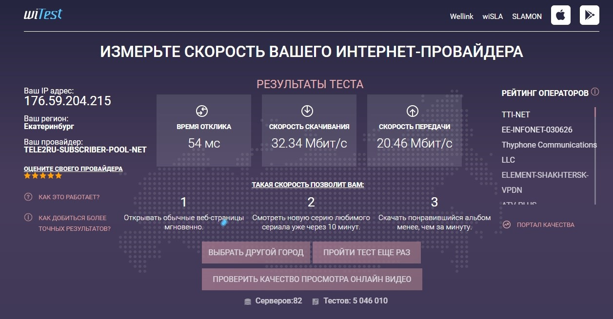 Ну вот, мы теперь с прекрасным интернетом! Результат даже превысил все ожидания. Хотя для полноты эксперимента нам не хватает теста от Яндекса. Но он всегда показывал меньше, чем speedtest, поэтому даже проверять расхотелось. Проверим не Яндексом, а другими не очень известными сервисами. Поисковик выдал несколько подобных сервисов. Выбираем первый попавшийся, это witest: