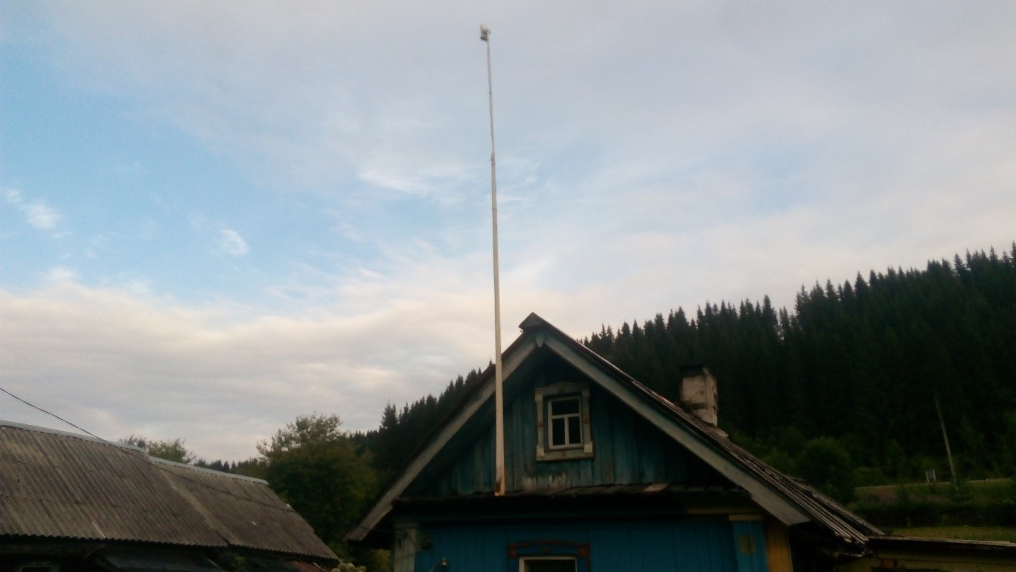 Установили, старая деревянная гардина подошла как родная, тем более она сегментная и можно удлинить, если что-то пойдет не так, а я ее выкинуть хотел. Если смотреть с такого ракурса, то соседская крыша явно будет мешать качественному приему сигнала: