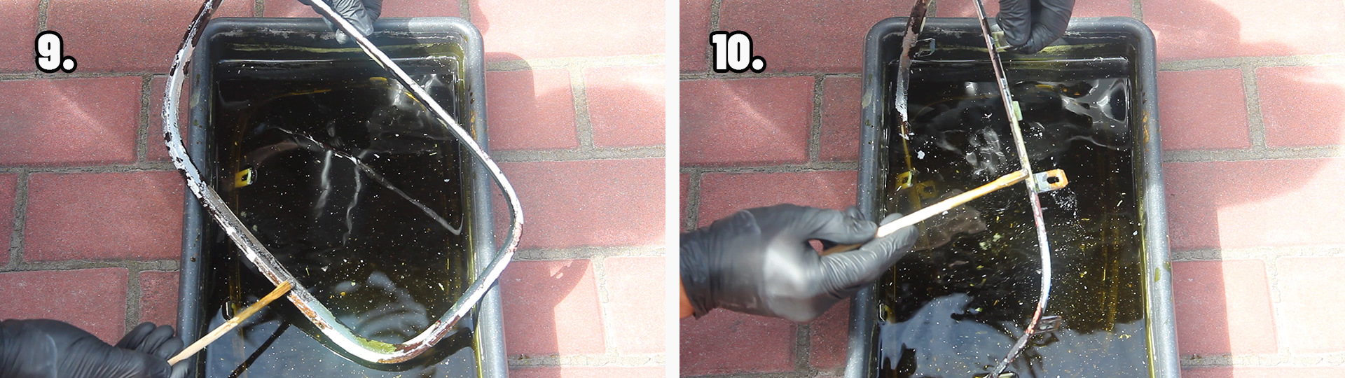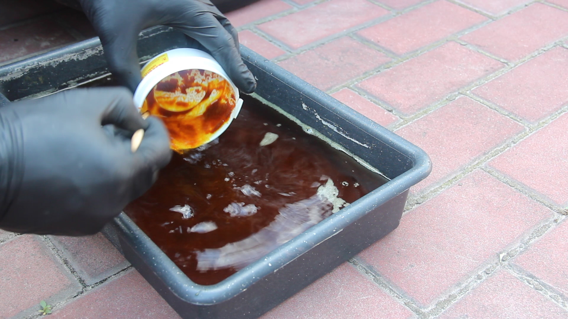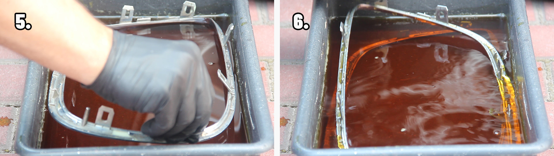 Раствор хлорного железа необходимо готовить из расчета 1:3 (одна часть хлорного железа, на три части воды) отталкиваясь от веса. Желательно использовать дистиллированную воду или кипяченую воду (в кипяченой воде 60-80 градусов, хлорное железо растворяется гораздо быстрее). Также следует готовить раствор хлорного железа в термостойкой пластиковой посуде, нельзя использовать металлическую посуду для приготовления раствора. Хлорное железо необходимо засыпать В ВОДУ небольшими порциями и размешивать, не наоборот! При растворении хлорного железа в воде, можно увидеть бурную реакцию – раствор может бурлить, кипеть и выделять пар, вдыхать пары ни в коем случае нельзя. ВАЖНО: лучше всего делать травление на открытом воздухе в маске или респираторе, также работать нужно в перчатках, есть большая вероятность получить ожог при попадании на тело. На растворение хлорного железа в воде у меня ушло порядка 15 минут, раствор хлорного железа растворился весь, без осадков на дне посуды. От себя добавлю – спешка ни к чему, все нужно делать размеренно и аккуратно. Для Вас подготовил видео процесса травления хрома решетки радиатора: