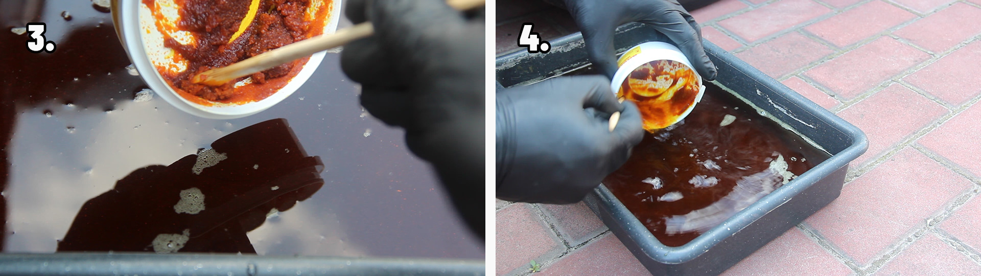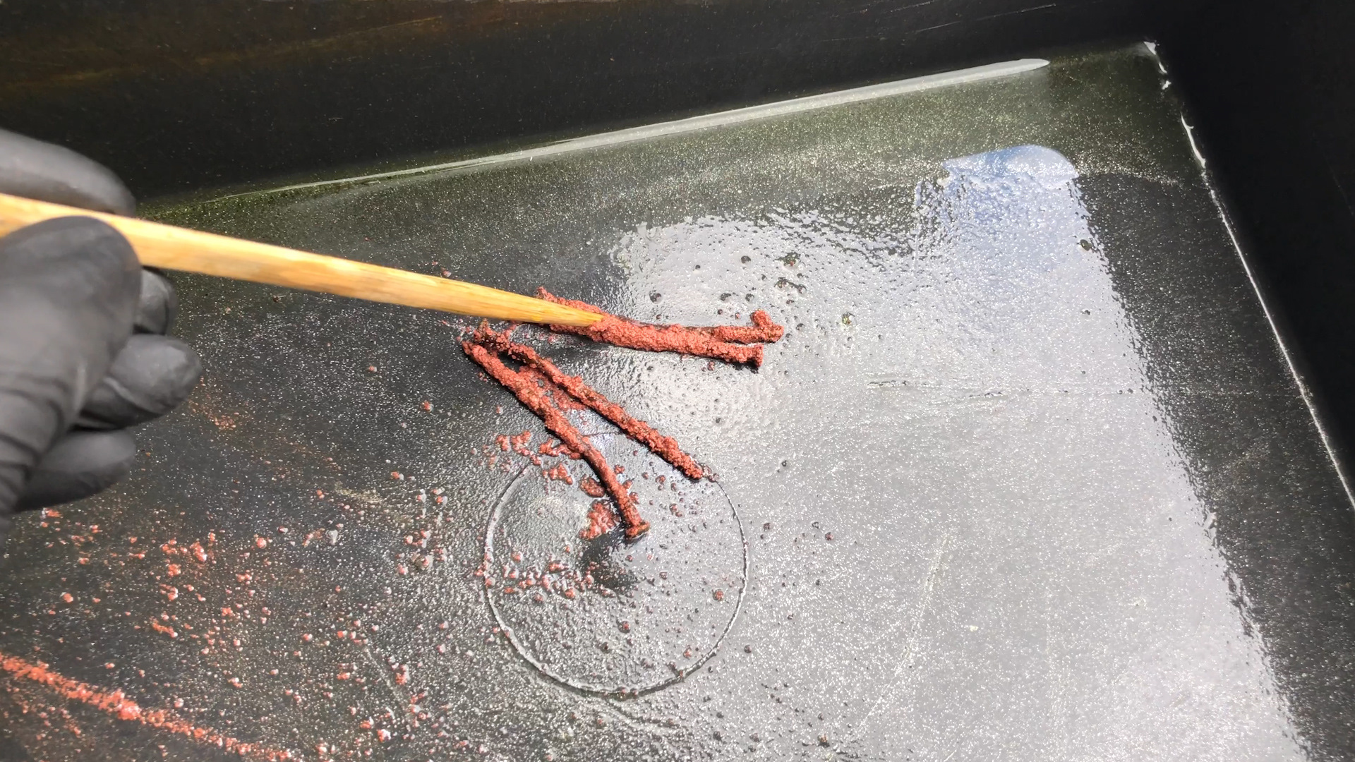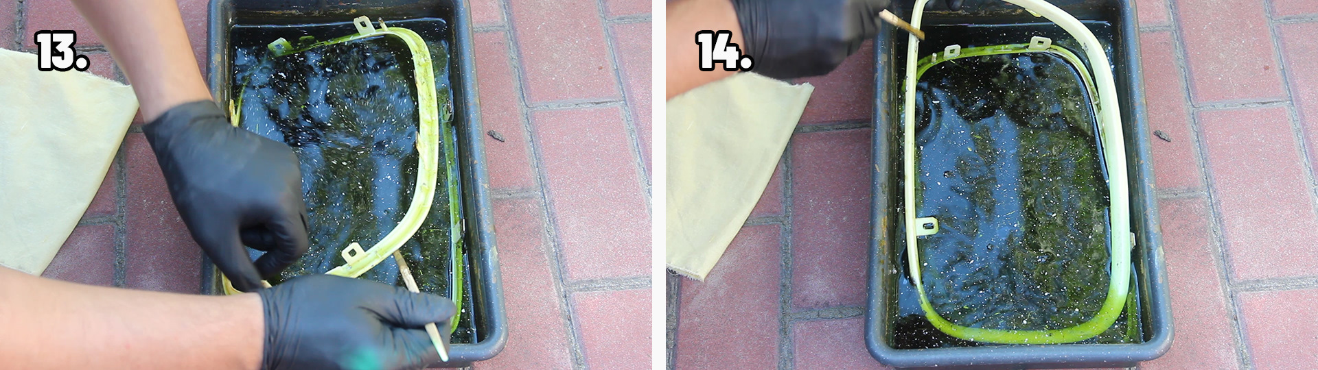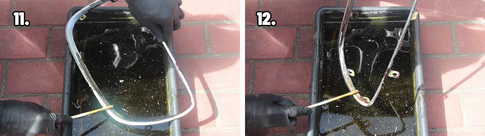 Раствор хлорного железа необходимо готовить из расчета 1:3 (одна часть хлорного железа, на три части воды) отталкиваясь от веса. Желательно использовать дистиллированную воду или кипяченую воду (в кипяченой воде 60-80 градусов, хлорное железо растворяется гораздо быстрее). Также следует готовить раствор хлорного железа в термостойкой пластиковой посуде, нельзя использовать металлическую посуду для приготовления раствора. Хлорное железо необходимо засыпать В ВОДУ небольшими порциями и размешивать, не наоборот! При растворении хлорного железа в воде, можно увидеть бурную реакцию – раствор может бурлить, кипеть и выделять пар, вдыхать пары ни в коем случае нельзя. ВАЖНО: лучше всего делать травление на открытом воздухе в маске или респираторе, также работать нужно в перчатках, есть большая вероятность получить ожог при попадании на тело. На растворение хлорного железа в воде у меня ушло порядка 15 минут, раствор хлорного железа растворился весь, без осадков на дне посуды. От себя добавлю – спешка ни к чему, все нужно делать размеренно и аккуратно. Для Вас подготовил видео процесса травления хрома решетки радиатора: