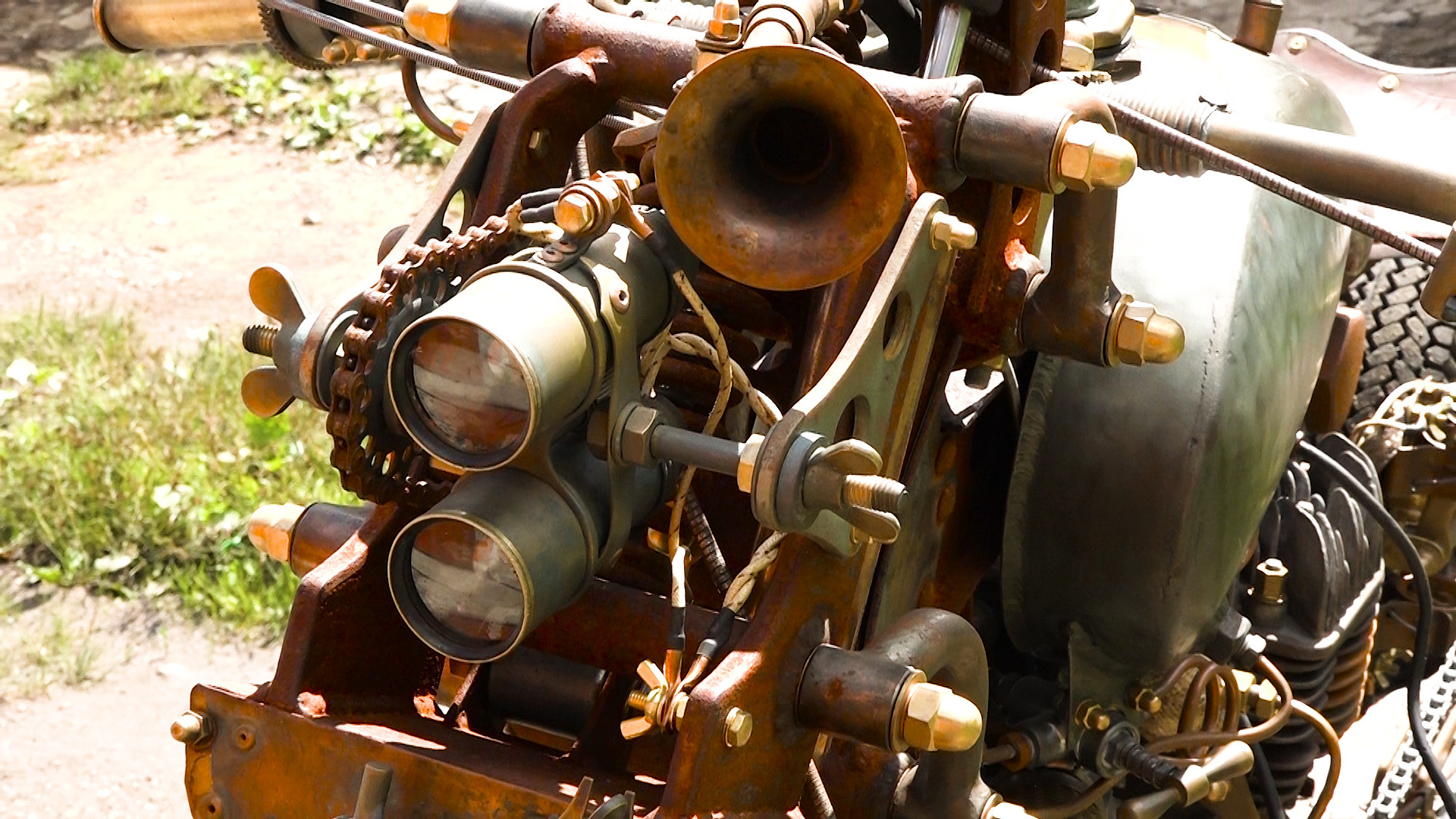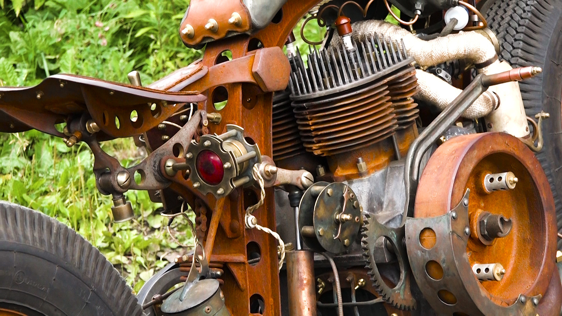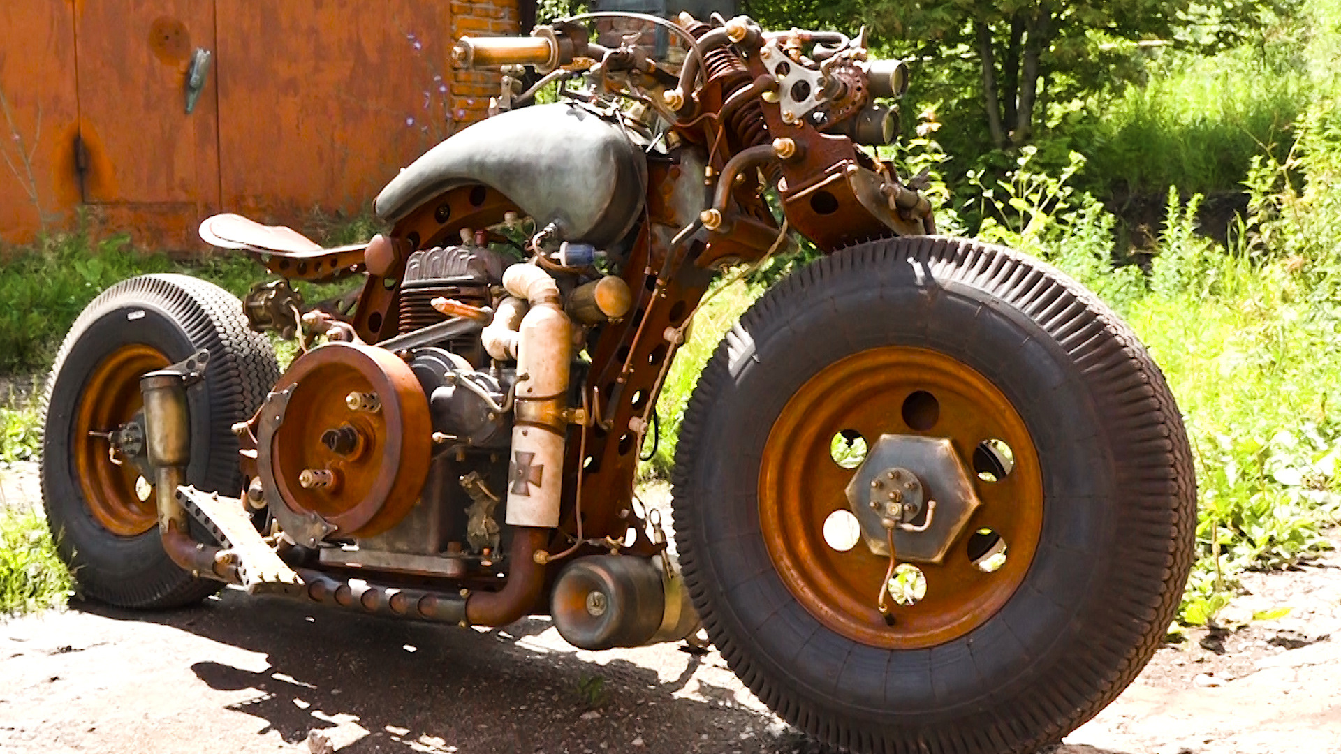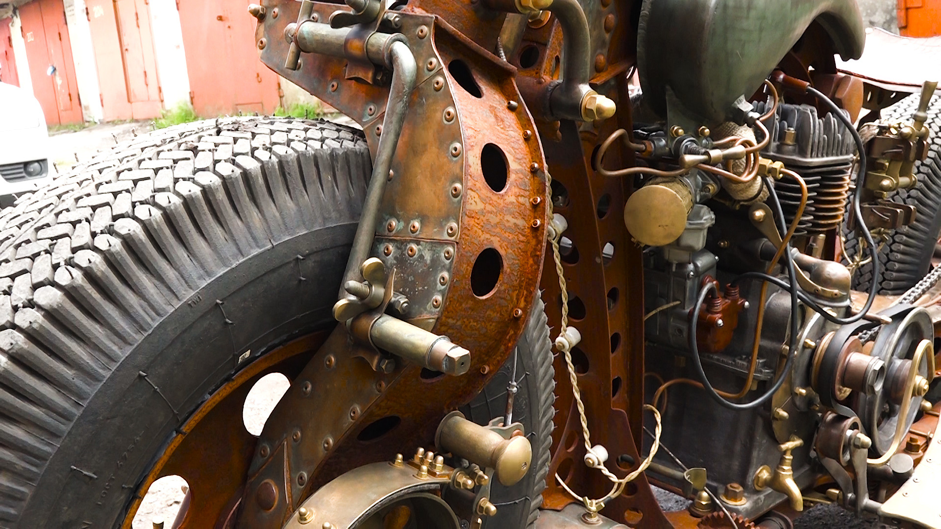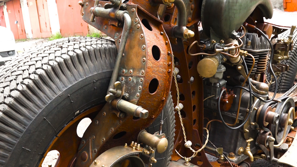 Да-да, в этом мотоцикле есть кусок самовара. Если присмотреться, его легко заметить. А вот пряники в конструкции не применялись. Но интересно в этой конструкции другое.