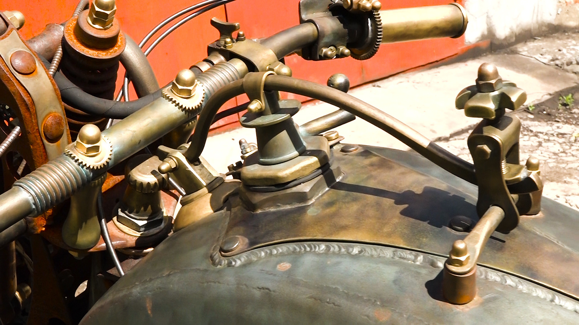 Во-вторых, здесь огромное количество элементов, которые выглядят откровенно декоративными, но на самом деле они работают. Пример: подножка убирается с помощью специального механизма, управляемого рычагом на баке. Бинокль действительно работает сдвоенной фарой и механизмы вокруг нужны для ее регулировки