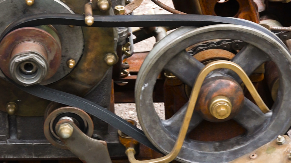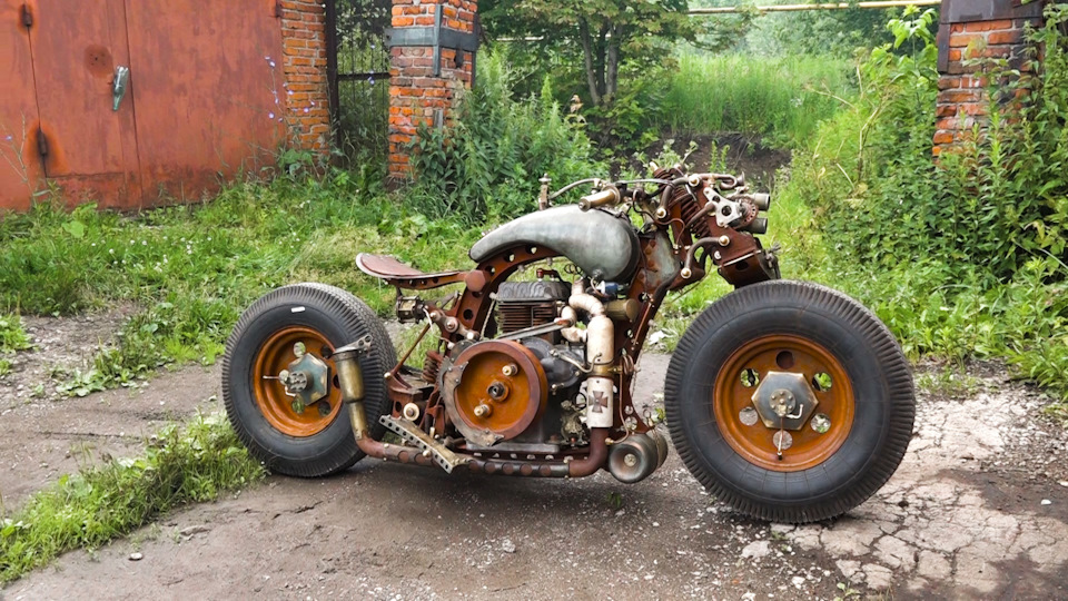 Здесь нет коробки передач, зато есть ленточные тормоза! Да-да, те самые, что не ставят на мотоциклы уже примерно сотню лет. Причем вся эта система целиком и полностью изготовлена вручную в гаражных условиях. А, сцепление! Чтобы мотоцикл поехал, надо нажать сцепление. Да, именно так. Подробнее — в видосе.