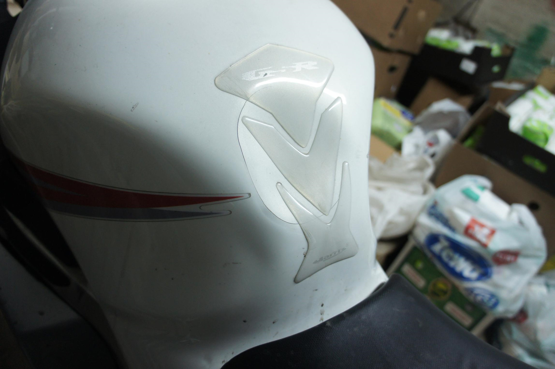 Слетал с джиксера при лобовом ударе. Погнул яйцами бак, а уже дальше всё смёл собой когда летел: приборку, пластик, стекло и пр. Ничего себе не оторвал)