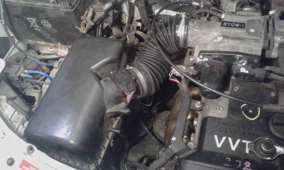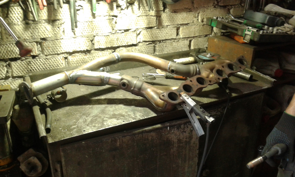 Мотор нам достался с одним обрезанным коллектором, поэтому пришлось Сане его "доработать напильником". Кстати, ещё один признак Аристо-моторов — два банка на выхлопе. Ну и наличие MAF-а. С ним, кстати, тоже были небольшие приключения.