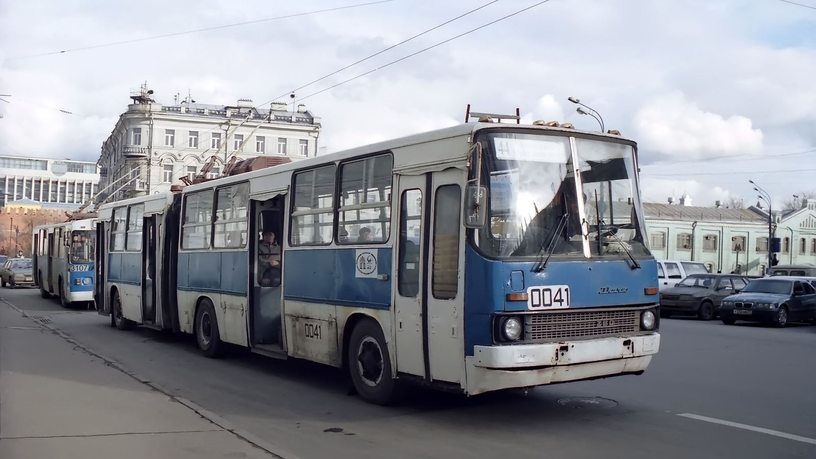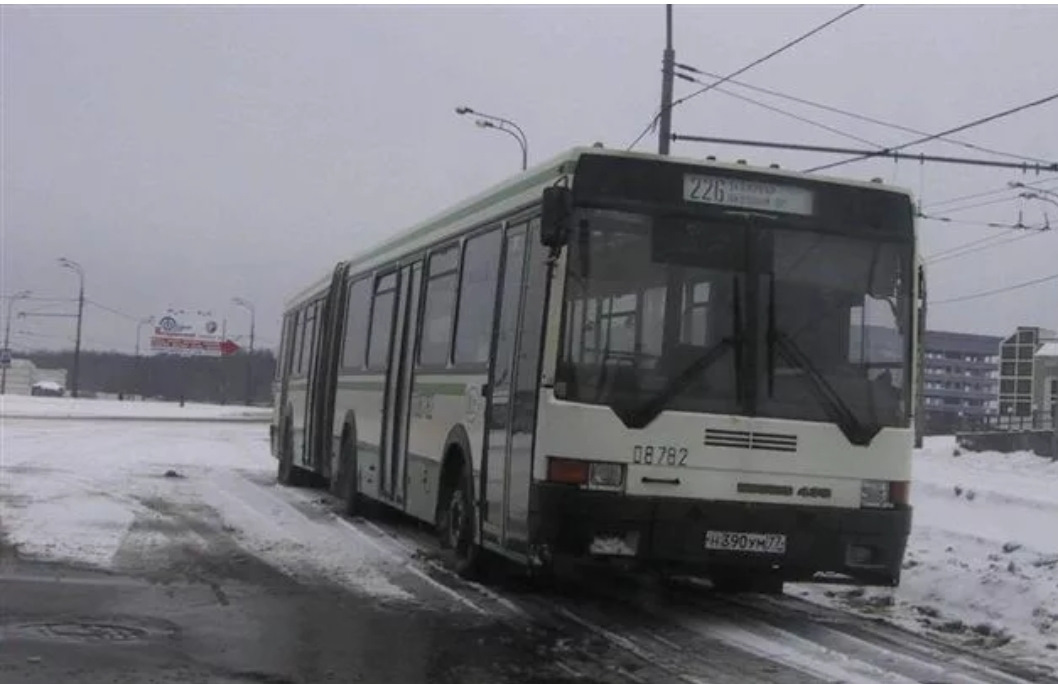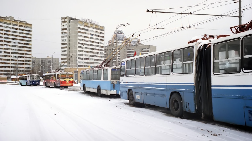 Москва встретила снегом чуть не по колено. Мы с бодунища кое-как это переварили, но когда вышли в город, а там… сине-белые (!) Икарусы со штангами!
