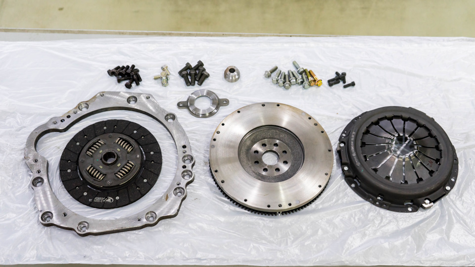 Проблем множество. Во первых на алюминиевом маховике нет проточки под диск сцепления — она составляет 12 мм поэтому этот параметр компенсируется шестигранными втулками. Во вторых диск сцепления не имеет пружин так как рассчитан на работу с двух массовым маховиком. То есть весь крутящий момент переносится на КПП напрямую, а не сглаживается демферами. Таким образом синхронизаторы будут обладать меньшим ресурсом. Далее вес самого маховика из алюминия — он легкий. В БМВ установлен двухмассовый маховик который в 2 раза тяжелее, поэтому применена корзина меньшей массы. На практике устанавливая такой комплект на jz мы снижаем инерционную массу, что приведет к потере тяги на определенных оборотах, мотор придется крутить постоянно, про движение в натяг которое регулярно происходит не только в городе, но и в грязи придется забыть . Помимо этого подпалить сцепление в грязи можно без труда — всякое может случиться. Накладку выгнет винтом ее придется менять так как она хуже отводит тепло нежели маховик который сделан из чугуна или стали. Но и самое главное длинна болтов 100 мм и проставка которая крепится к эконом маховику это просто шедевр инженерной мысли…