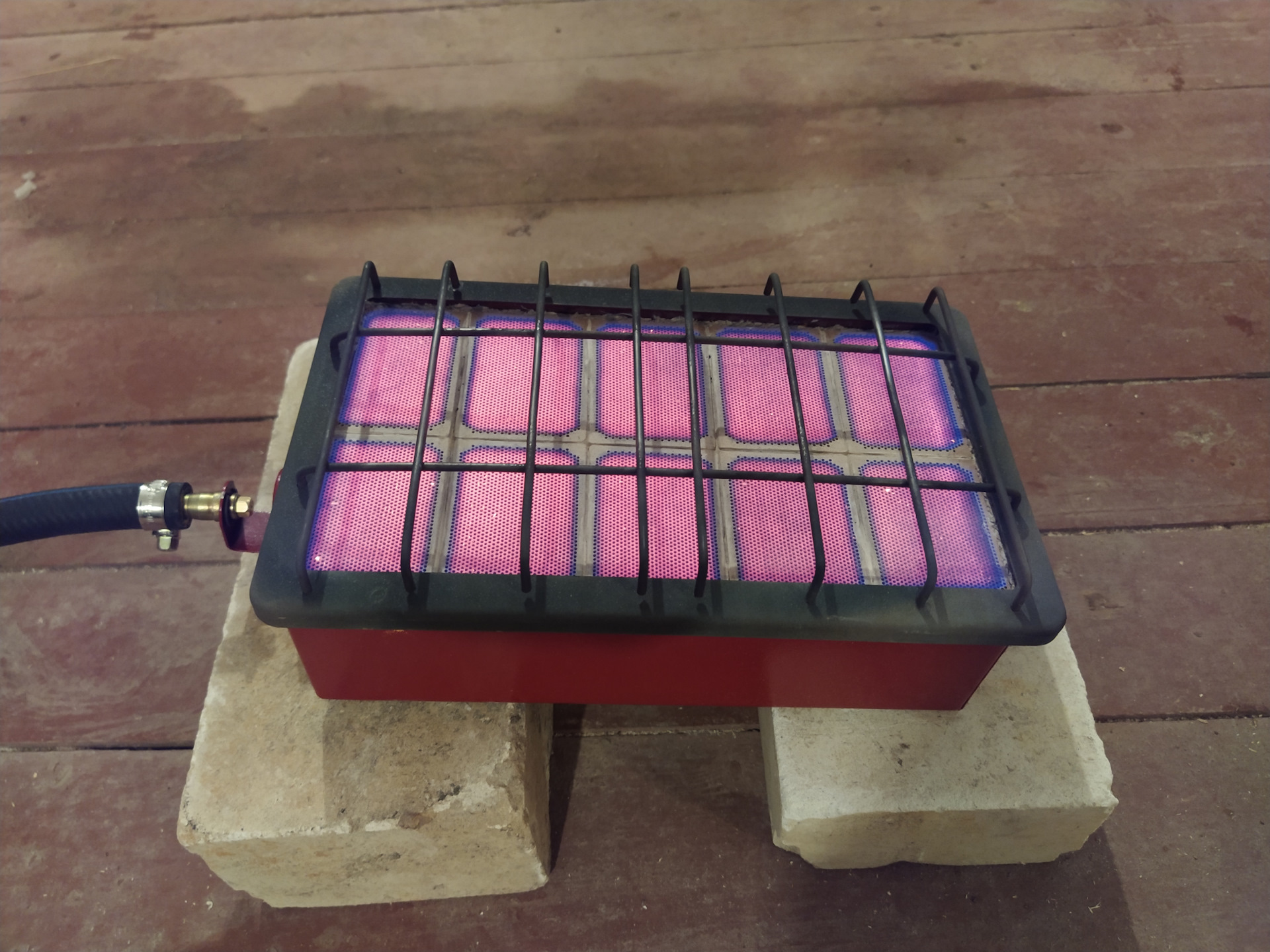 Вот так стала гореть после небольшой модификации. Горелкой действительно доволен, с диаметром отверстия форсунки 1.02 мм развивает максимальную мощность без внешнего пламени.