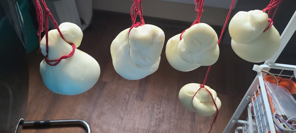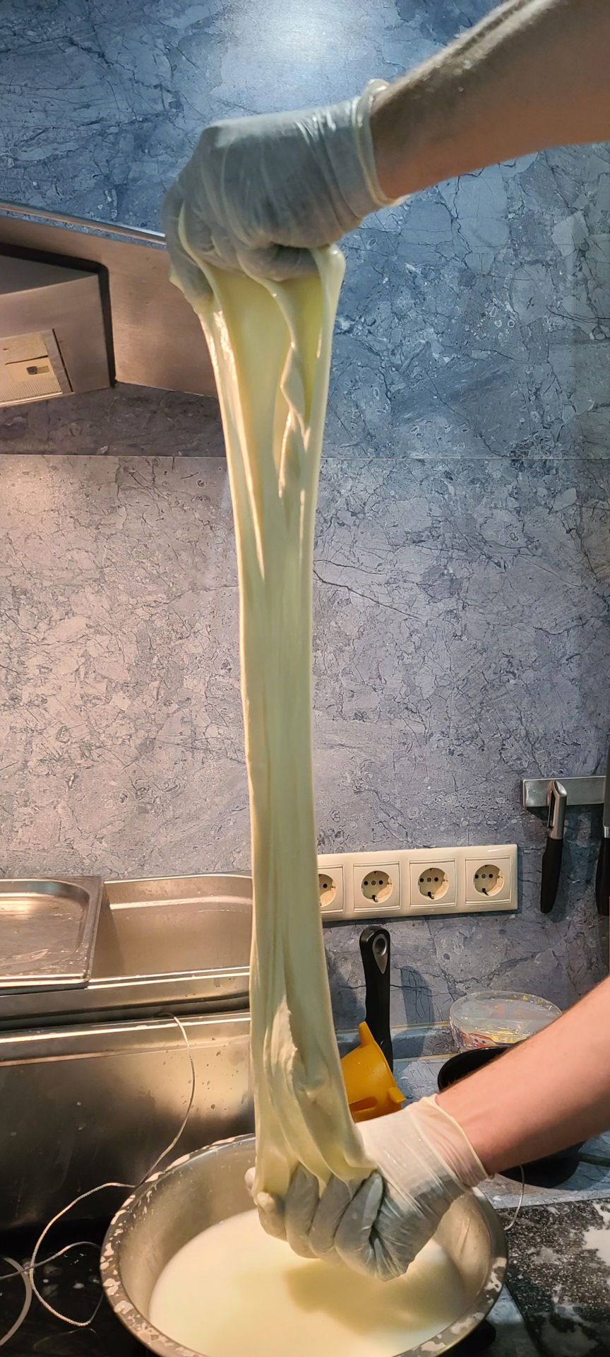 Особенность сыра в том что после образования зерна его "плавят" в горячей воде, вытягивают и формируют мешочки.