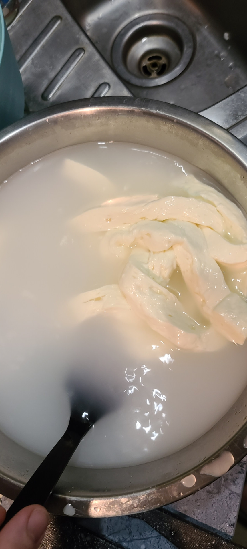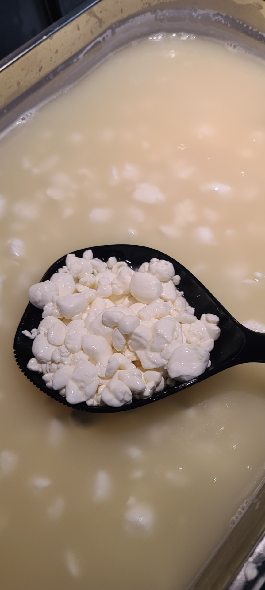 Так как ph метра у меня пока нет, проверяел кислотность по простому. От сырного теста отрезается маленький кусочек, заливается кипятком в 80гр, нагревается и тянется. Если рвётся сразу, не набрал, если как плавленый сыр тянется — время вытягивать…