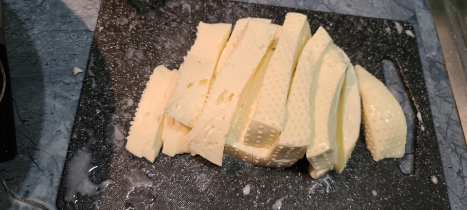 По прошествии 27 мин после внесения сычужного фермента проверяем сгусток на чистое отделение и начинаем нарезку. Нарезка у этого сыра крупная. Режем в 2 этапа с перерывом 5 мин.