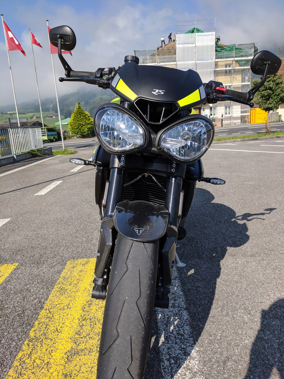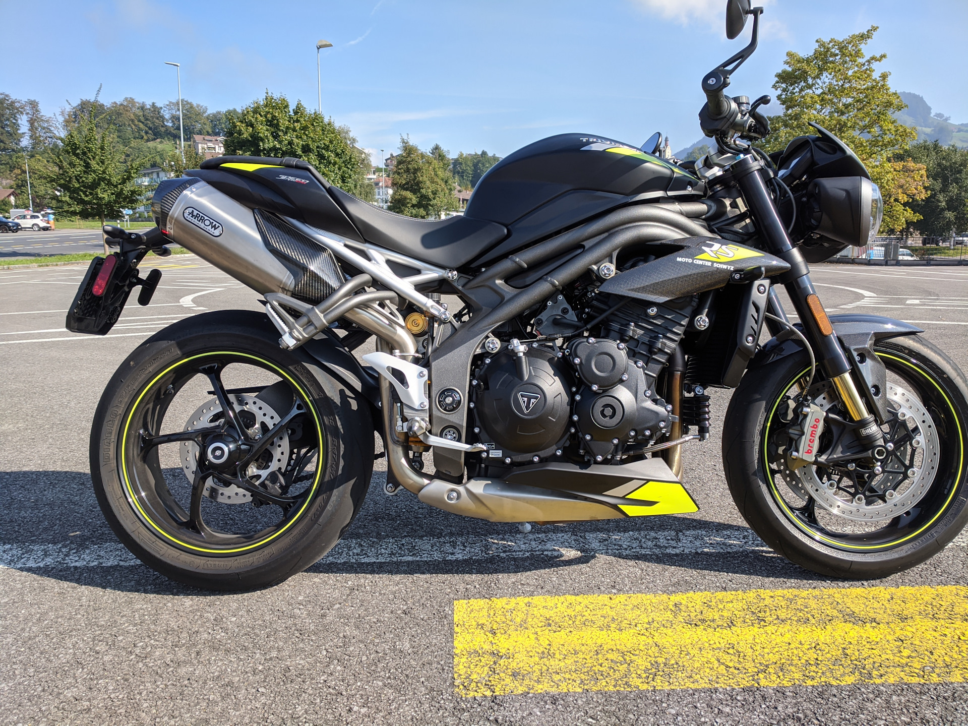 Я не могу что-то сказать об изменениях в отдаче мотора, прошло три года, и в любом случае надо сравнивать именно друг за дружкой, но мощности в доработанном 765 моторе достаточно, особенно если вам нравится раскручивать мотор, а этот мотор очень хочется раскручивать, он поет свою волшебную трехцилиндровую песню со смаком. Из-за этого этот мотоцикл опасен для водительских прав, его постоянно хочется выкручивать до высоких оборотов и слышать этот шершавый рев, но даже в гору он разгоняется очень быстро на 3й, не говоря уже о 2й передаче, а в Швейцарии такие игры очень чреваты БОЛЬШИМИ проблемами с властями, не говоря уже о кошельке и об экспроприации и продаже на аукционе транспортного средства. Street 765 RS напоминает Дайтону 675 последней версии (как у меня), у Дайтоны все равно чуть больше мощности, а крутящий момент примерно одинаков, хотя у Стрит значительно больше момента на средних оборотах, но по поведению примерно одинаковы. Дайтона все равно управляется лучше, лежит на дороге и поворачивает лучше, но это чистокровный гоночный мотоцикл, не родстер без обвесов и с коромыслом.