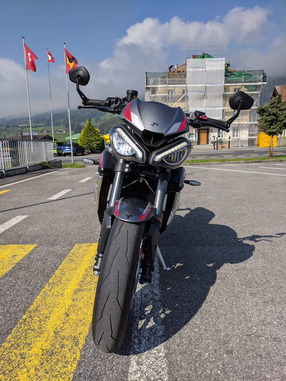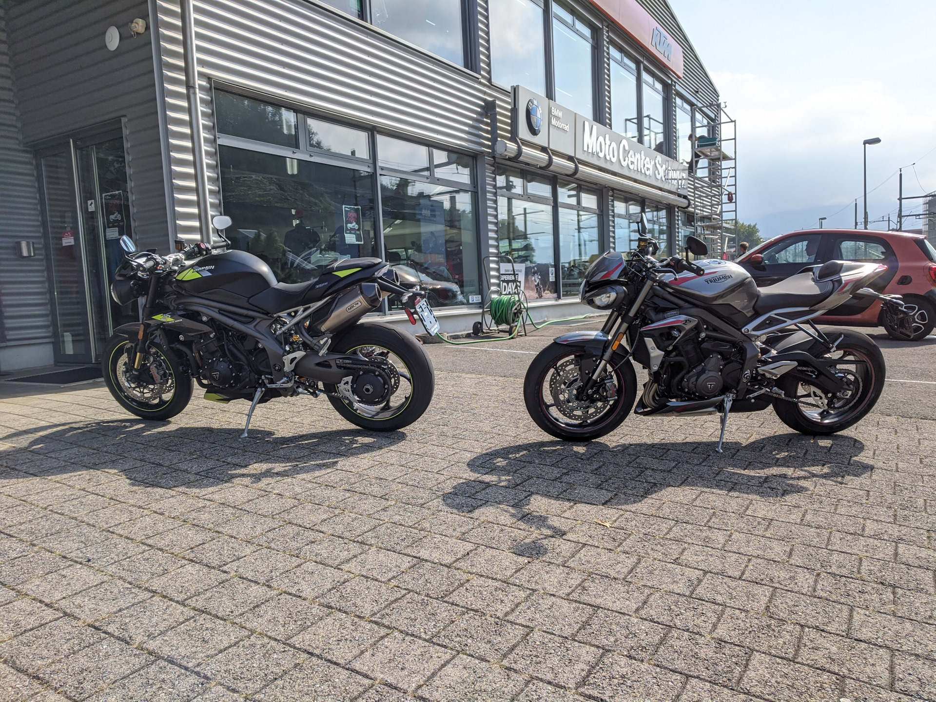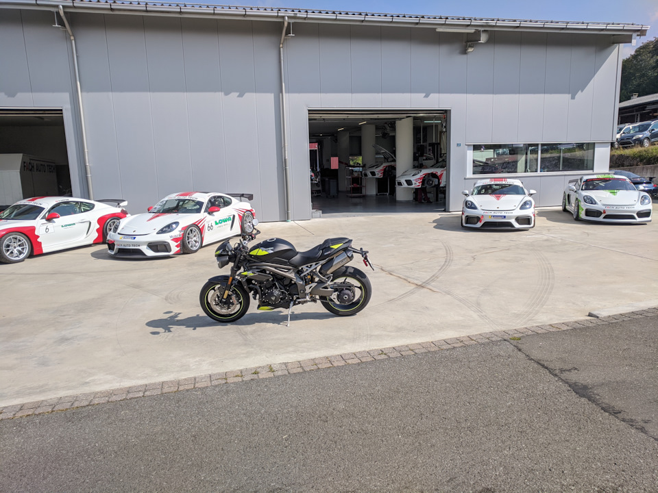Дилер (Триумф, БМВ и КТМ!) находится у подножья горы, так что там есть где потестировать разгон, торможение, разные скоростные интервалы, и управляемость в виражах вверх и вниз.