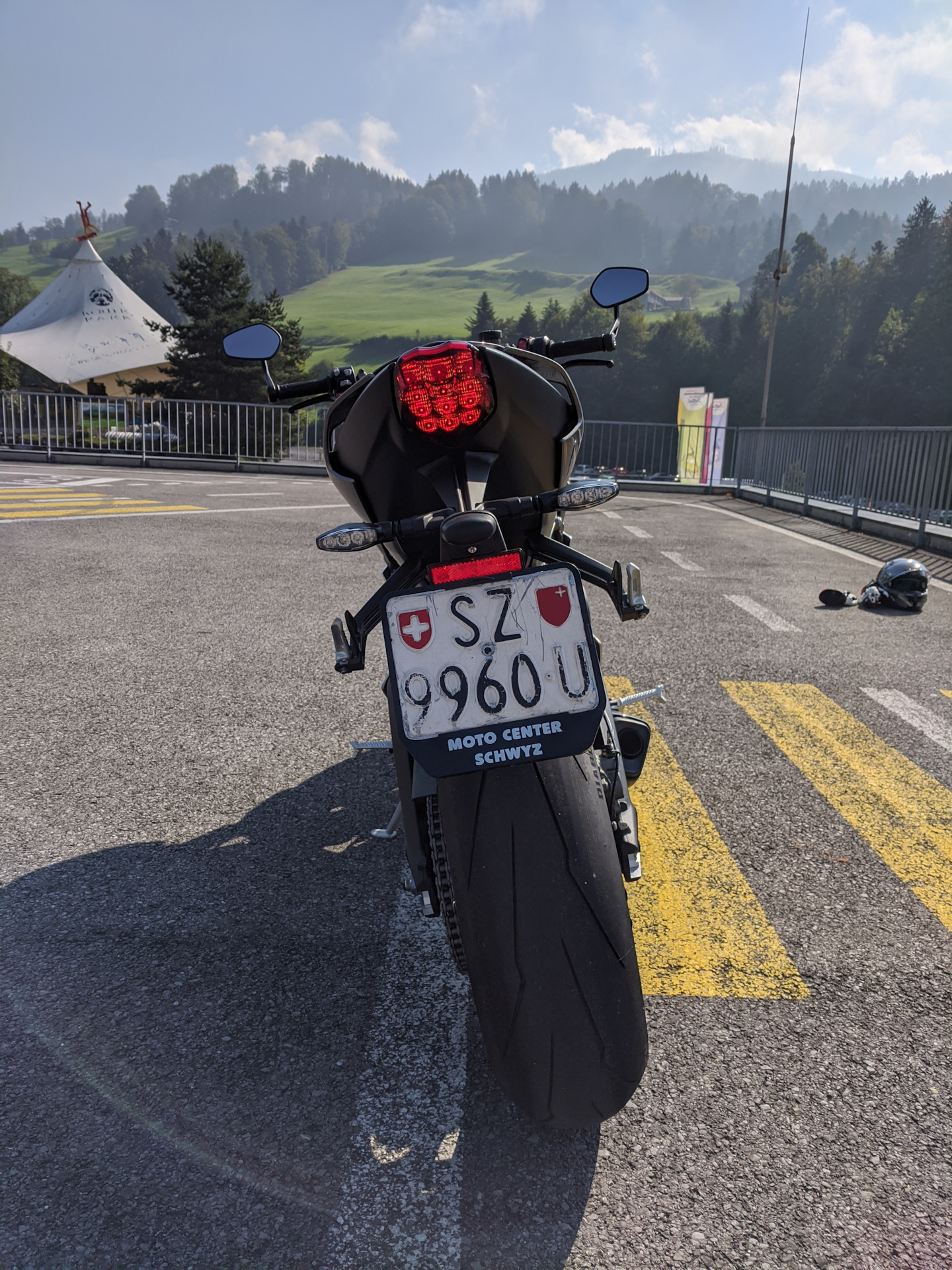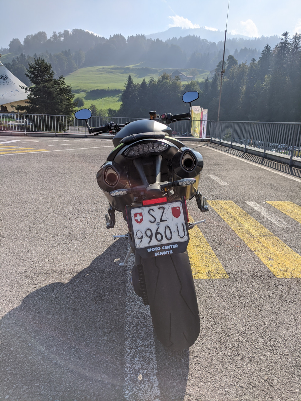 На парковке, там вроде детской площадки с разметкой дорог, поворотов, улиц, может детей учить на игрушечных машинах правилам и навыкам вождения, я поездил на Спид медленно, порулил по всем этим игрушечным улочкам и поворотам, 215кг массы или что-то около того, рулится медленно отлично, не хуже Стрит, только на очень медленных поворотах ощущаешь что да, тяжелее и масса выше.