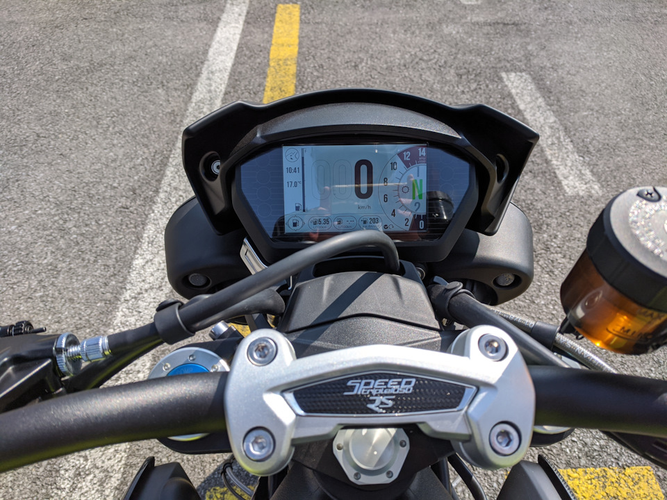 Круиз-контроль в стоке, подогревающиеся рукоятки можно дозаказать, как и квикшифтер/блиппер. В отличие от Стрит РС на Спид РС более продвинутая электроника, стоит инерционный блок IMU, угол наклона мотоцикла — фактор в работе АБС и трекшен-контроля. 5 режимов работы, включая трековый режим и полностью настраиваемый режим. Но вили-контроль еще не отдельный параметр, как на, скажем, Априлия Туоно, хотя кому что надо, лично мне этот параметр в выделенном виде не нужен.