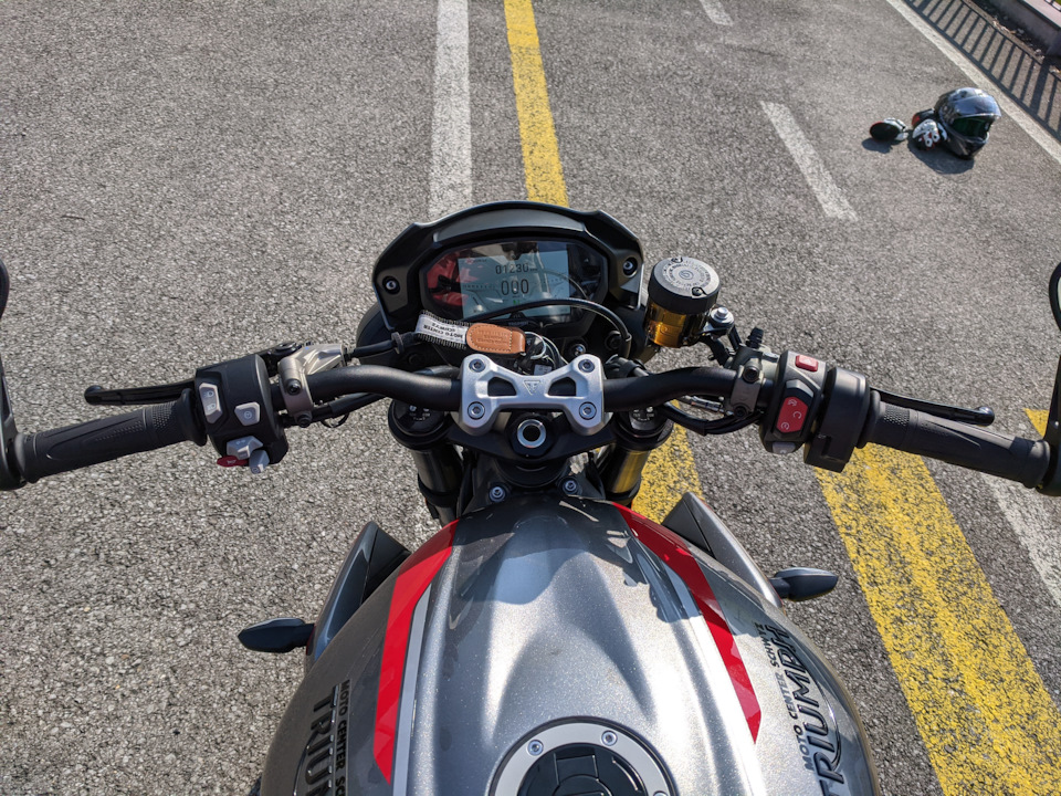 Сначала я уселся на Street 765 RS. Если сравнивать двигатели разного объема друг за дружкой, то, считаю, лучше начинать с меньшего объема, иначе впечатления от мощности и тяги большого мотора будут слишком превалировать над впечатлениями от (по крайней мере в данном случае) более низкой массы, лучшей поворачиваемости и тд менее объемного мотоцикла.