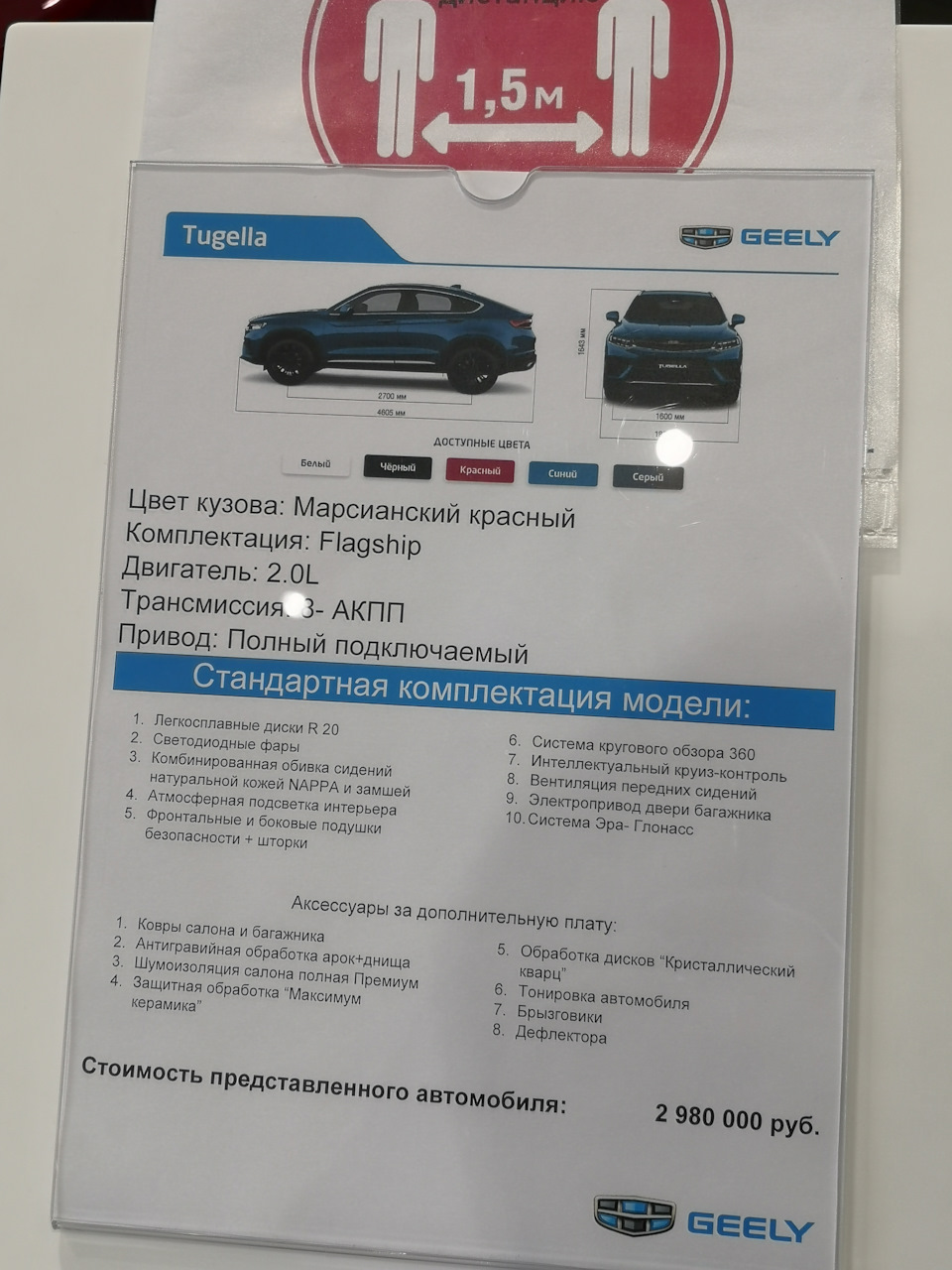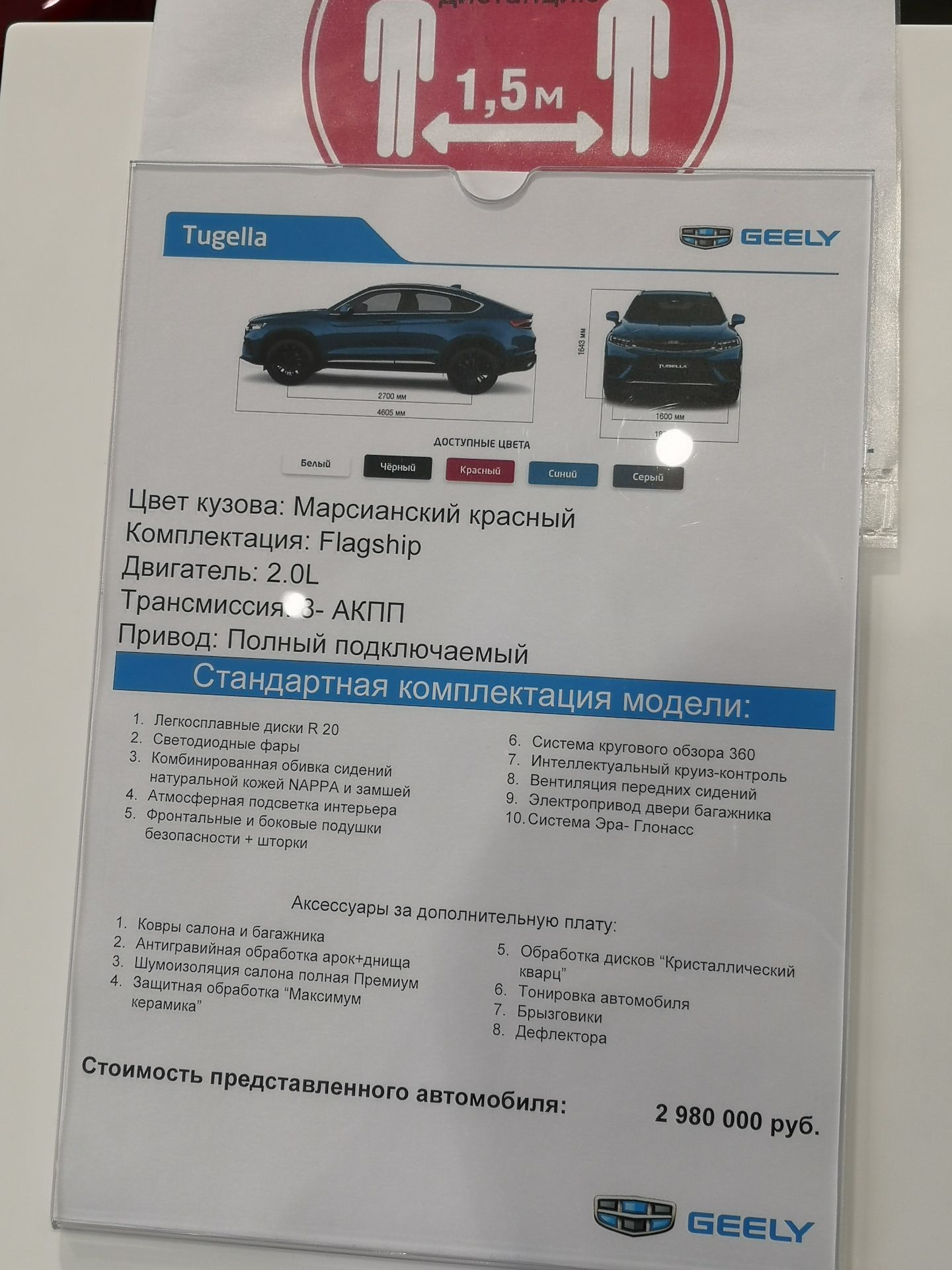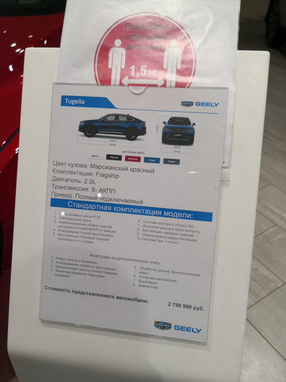 Зато кто вообще не стесняется плюсовать к рекомендованной цене, так это дилер Geely. Это уже совершенно другое место, и насмотрелся я тут на многое, но вот цена на модель Tugella меня ввела в некоторый ступор. Сейчас все объясню. Приехал я забирать согласованную машину на тест, так как с некоторых пор тестовый парк представительства переехал к официальному дилеру. Ну и пока ждал человека, кто отдаст мне ключи и документы, решил глянуть на ценники.