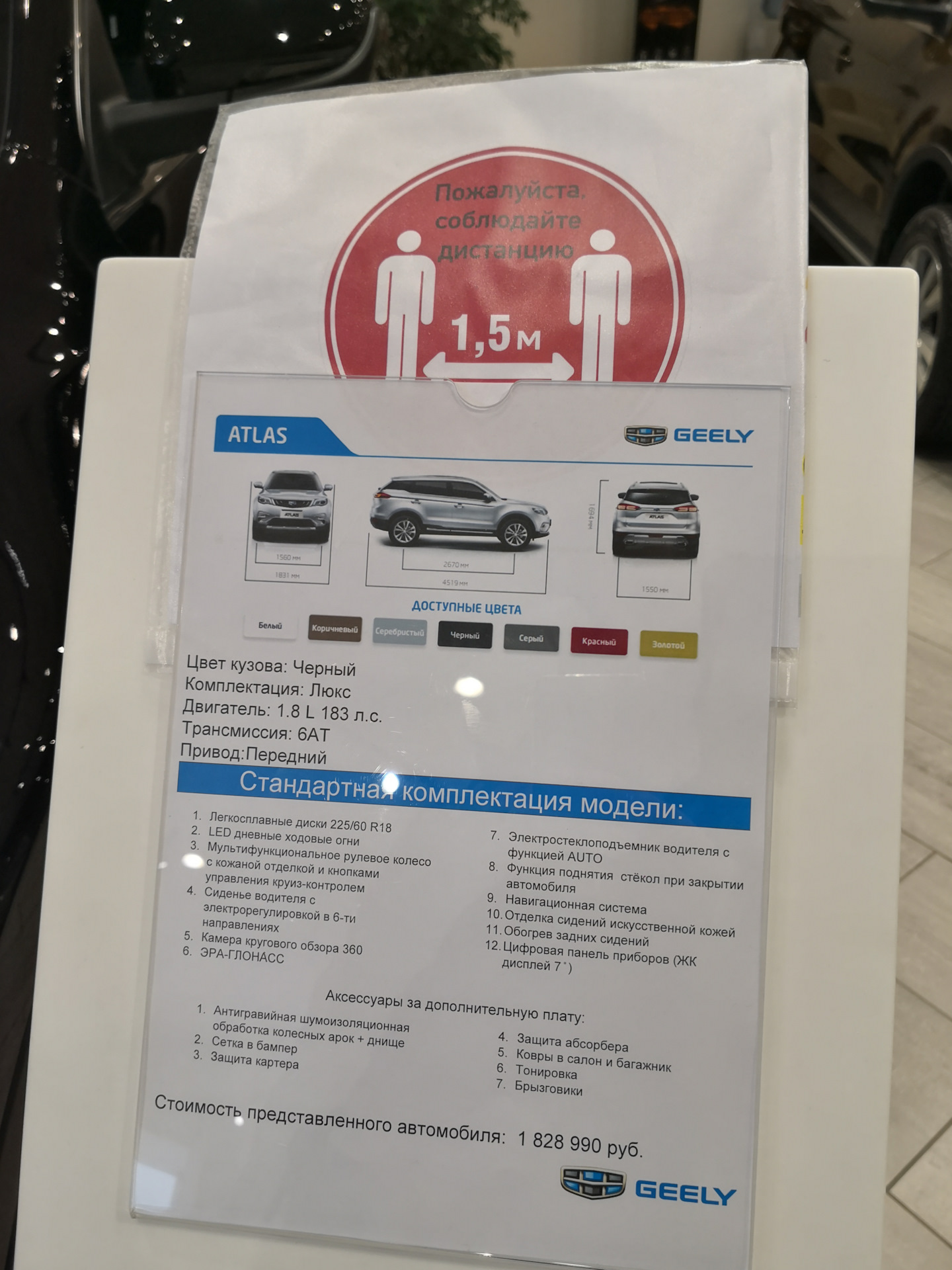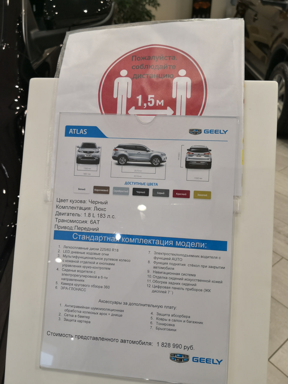 Помните такую машину Geely Atlas? Так вот на него наценка куда меньше: от 50 до 80 тысяч рублей. По сути, все дополнительные товары и услуги те же самые что и на Тугелле, за исключением некоторых обработок. Наценка на этот экземпляр — 59'000 р.