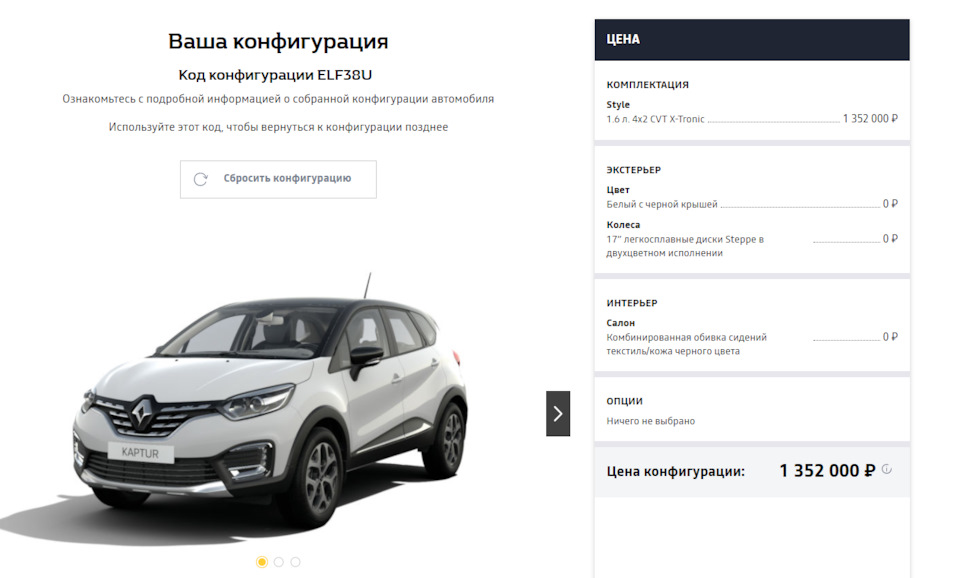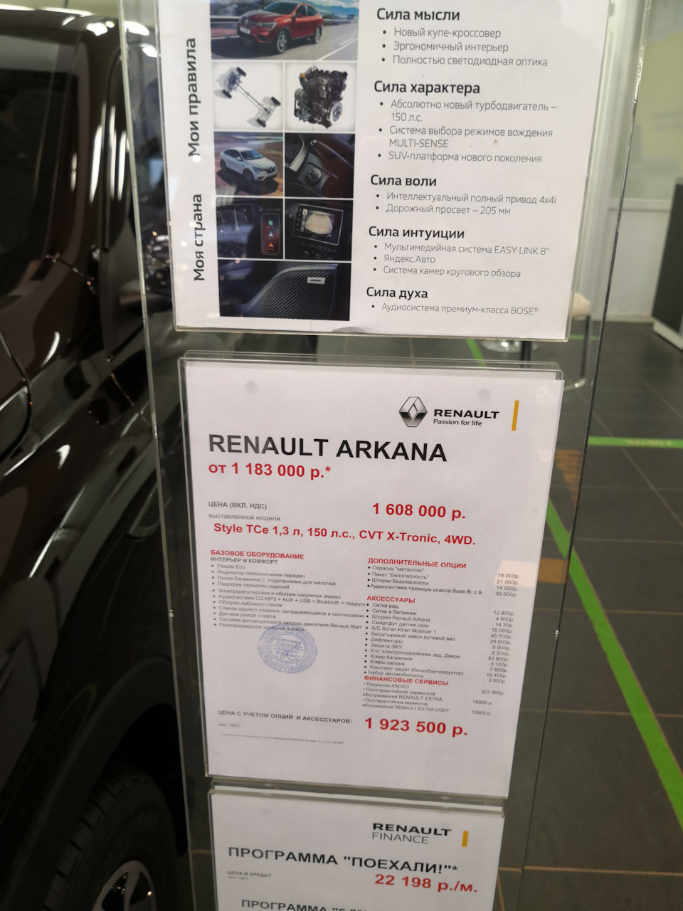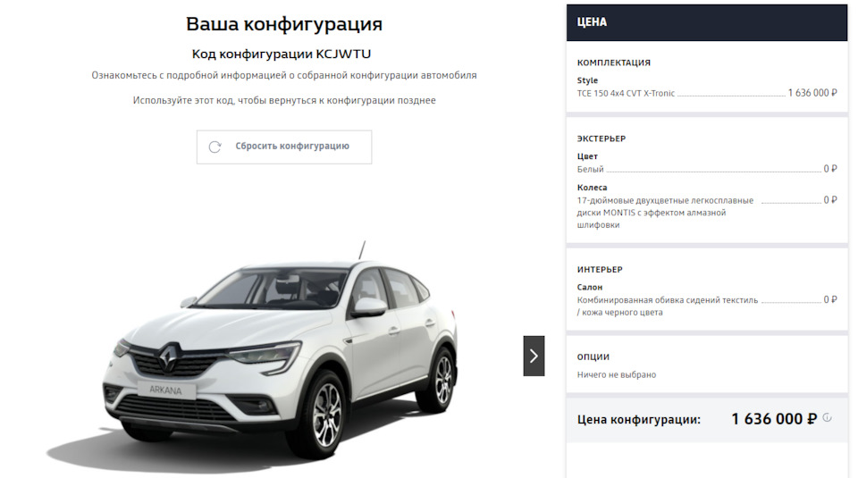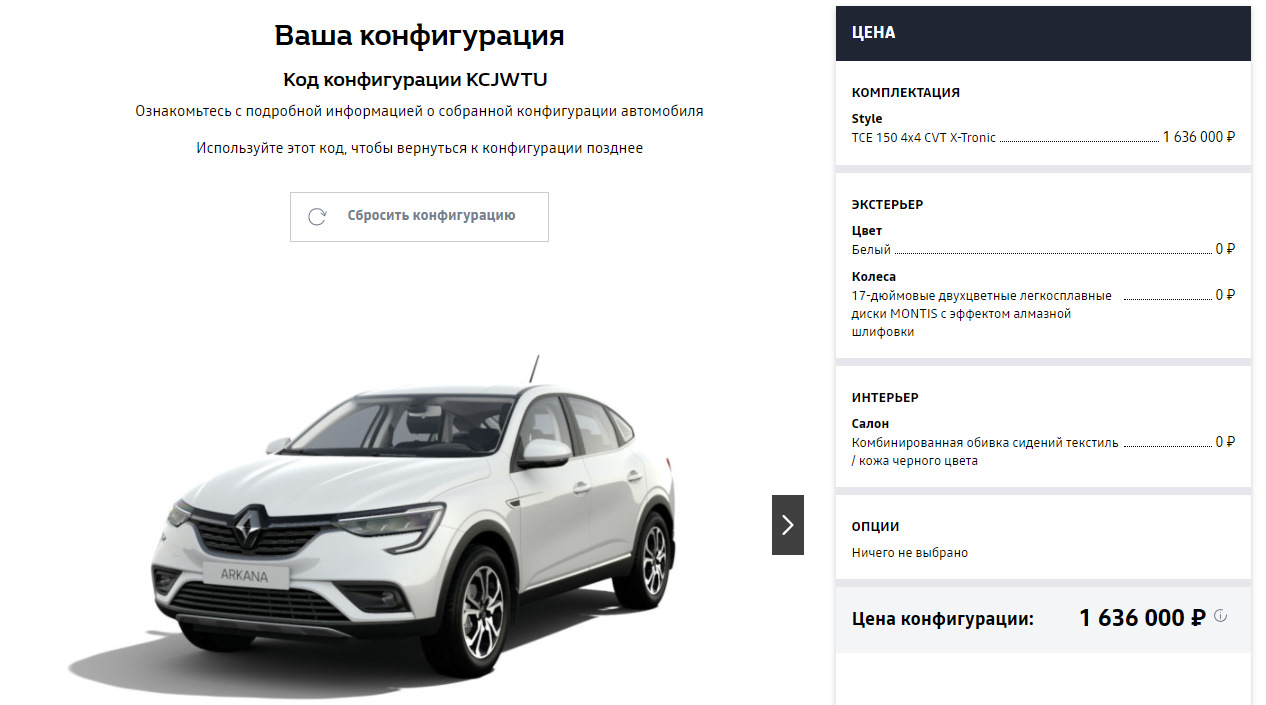 Это же было и с Arkana в версии Style, которую дилер оценил в 1’608’000 р., а конфигуратор собрал ту же комплектацию за 1’636’000 р.