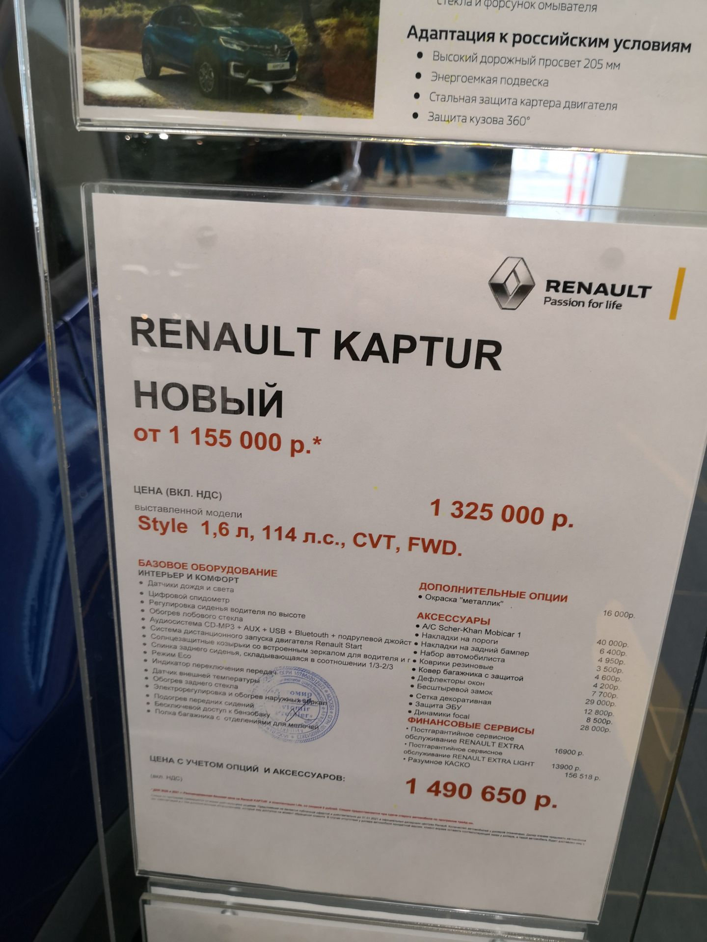 Зайдя в Renault, сразу начал искать подвох, но если с корейскими автомобилями я время от времени имею какие-то дела, то вот с франко-японцами нет. Поэтому, мне даже примерно не было известно, за сколько должна продаваться та или иная модель. Конечно, грозным взглядом я окидывал все, что попадалось на моем пути, и даже возмущался, почему это такие “конские” ценники нарисованы возле каждого авто?! Хотя, стоит отметить честность дилерского центра, ведь они не просто перечислили набор аксессуаров на каждом авто, но и написали цену за все в отдельности. Зафиксировав информацию на фото, я решил ознакомиться со всем дома, в спокойной обстановке. И какого же было мое удивление, когда я обнаружил, что дилер пишет стоимость автомобиля не в большую сторону от цен в конфигураторе, а в меньшую.