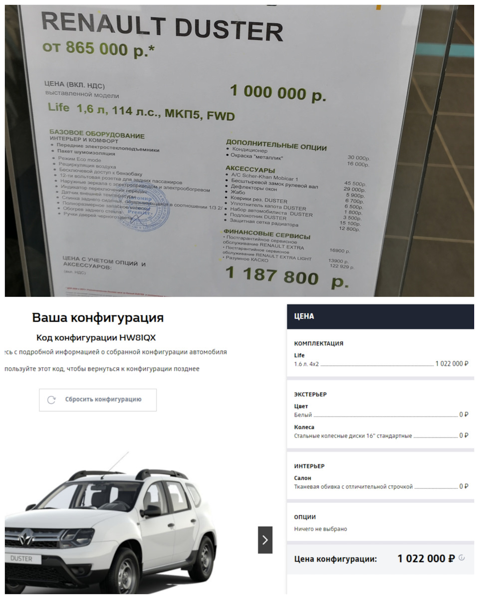 Да взять хоть Duster. Дилерский прайс дешевле конфигуратора на 22’000 рублей, при этом его обвешали аксессуарами на 141’800.