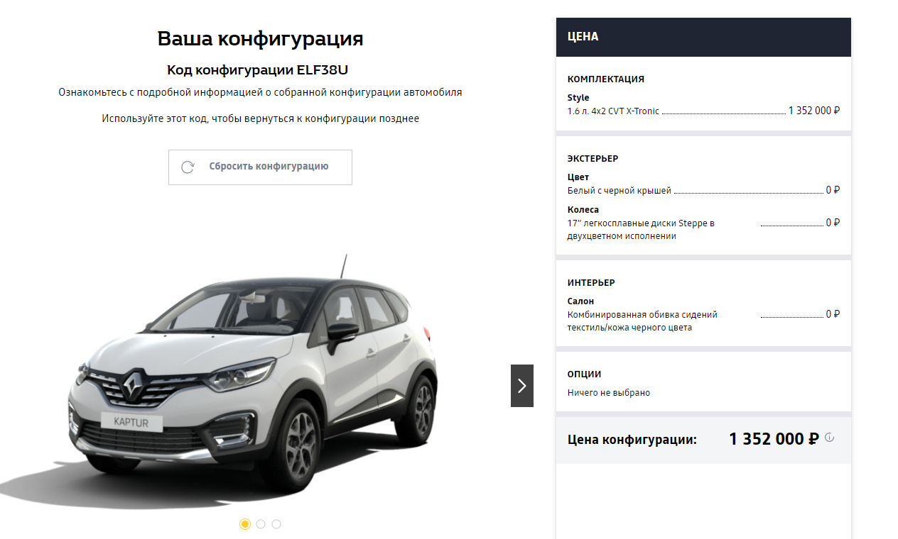 Взять хоть новый Kaptur : переднеприводный автомобиль в комплектации Style c 1.6-литровым мотором и вариатором оценен в 1’325’000 рублей.