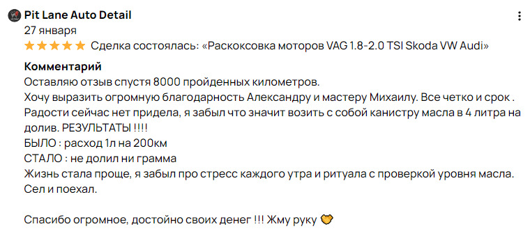 Приветствую!Шкода Октавия 2011 г.в.1.8 tsi.Масло стало активно угорать после 140 т.км.К 180 на 1000 расход составлял 2.5-3.л!На просторах интернета начал искать, кто, как решает проблему масложора, нашёл Александра с его статьёй и решил обратиться.Результат оказался просто потрясающий!Первую тысячу смотрел на щуп каждые 100 км пробега, честно говоря, не верилось, что проблема жора ушла.Но вот пробег 1000 и щуп на максимуме!Так проехал 3000 и поменял масло по рекомендации Александра.Сейчас проехал 7500 км и масло НЕ РАСХОДУЕТСЯ от слова ССОВСЕМ!Метод Александра реально работает, он честно предупредил, что не все двигатели удаётся раскоксовать, причины масложора бывают разные.Но, как я понял, у этих двигателей причина масложора в основном, залегание поршнвых колец, и ребята эту проблему решают!Спасибо им огромное!