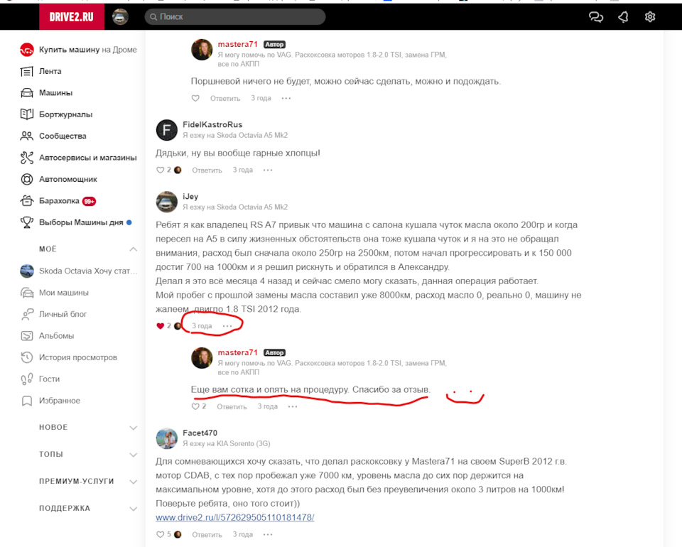 Расскажу свою историю про раскоксовку. Шкода Октавия 2011года выпуска 1,8 ДСГ покупал новую в салоне. Замена цепи ГРМ у оф. дилера в Туле (при пробеге 170000 лето 2018) совпала с началом заметного расхода масла, литрушки от замены до замены на 15000 км стало мало. Через год начал изучать вопрос на драйве, понял что я не одинок, и масложор вполне распространенное явление для моего движка. На пробеге 190000 км и расходе масла 1 литр на 1000 км обратился к спецам по переборке двигателя ( замена поршней и колец и т.д.). Дорого. Пробовал рскоксовку Лавром в одном сервисе, всякие ликвиМолли-все это полная херня. Копил на капиталку. Расход масла дошел до 1,5 литра на 1000 км и наткнулся па просторах драйва2 на mastera71. Написал — приезжай, поможем. Это всё происходило летом 2021 года, пробег к тому времени был 234000 км. На сегодняшний день пробег 268000 км, проведено 4 замены масла — долив не больше 300 грамм от замены до замены, правда масло меняю через 5-7 тыс. Отзыв пишу по прошествии полутора лет — это реально, сделать раскоксовку и ЗАБЫТЬ о масложоре, главное чтобы работу выполняли Мастера с большой буквы! Огромный респект Александру и Михаилу. Всем рекомендую!