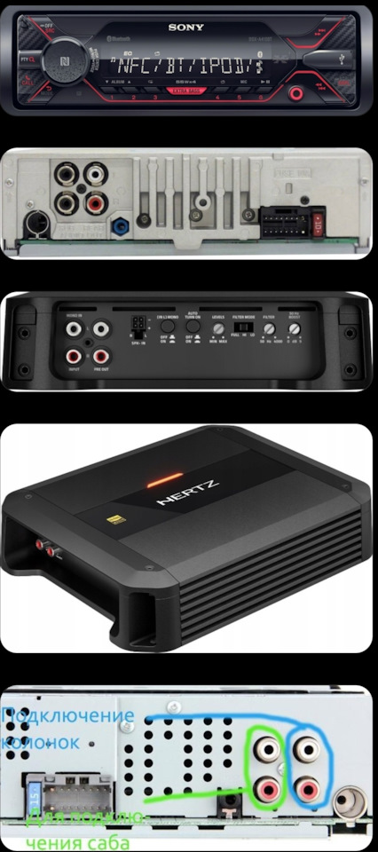 Всем привет, хочу спросить, куда подключить кабеля RCA. У меня Радио Sony dsx410bt и усилитель Hertz DP 2.200 на 520W двухканаловый. СЛЕПИЛ ФОТО И ПРИКРЕПИЛ ДЛЯ ПРИМЕРА. Проблема в том что я не могу разобраться куда какой кабель подключить. В радио — обозначение rca "sub audio" — "rear out". В усилители — обозначение rca "input" — "pre out". Самая нижняя картинка это пример нашёл в интернете, но не знаю ли это правильно подписано. Куда какой кабель сунуть. Спасибо большое 🙂
