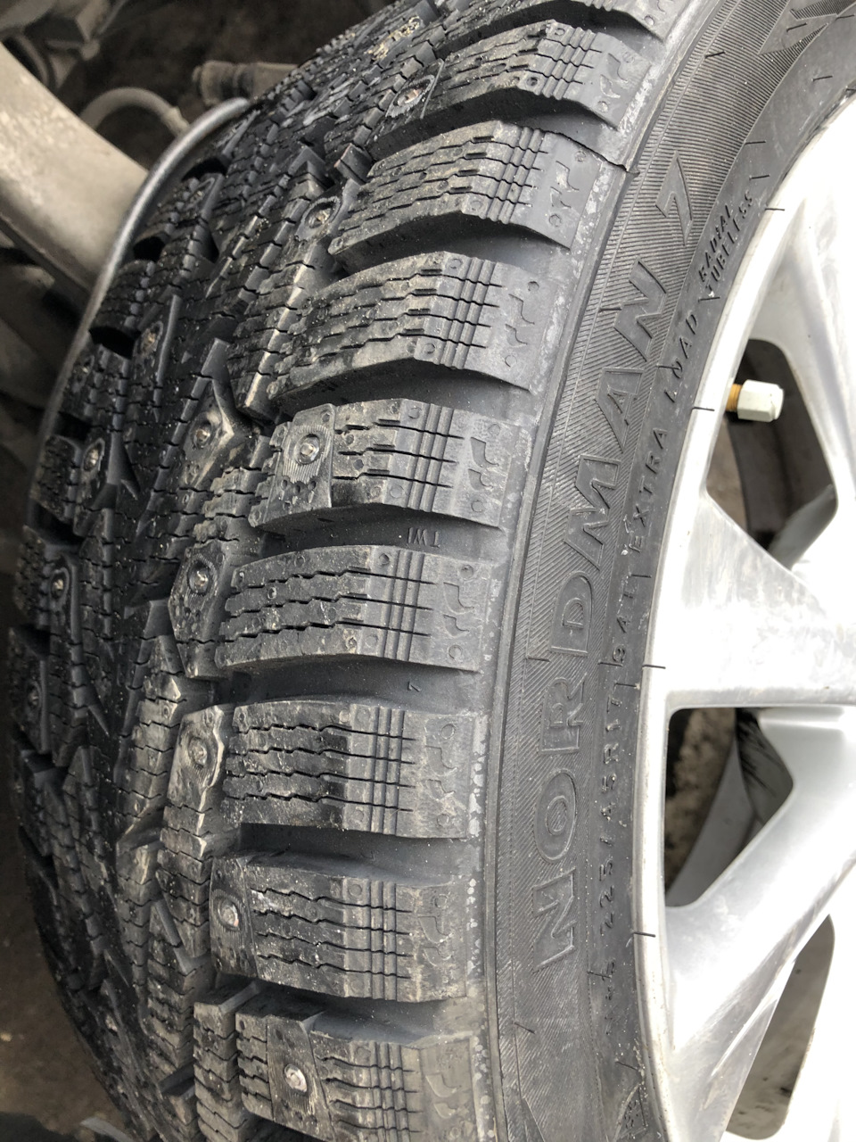 Собственно хакка7 или Нордман 7 суть одна . Резина оставила двоякие впечатления, точнее это резина для зимы)) Как ни странно звучит, но это резина как раз для снега, льда и прочих подобных замесов. Ни разу на заднем приводе я на ней нигде не застрял, снег роет как надо, на льду тормозит и трогается. Но есть и обратная сторона медали на сколько она хороша на снегу и льду на столько она хреновая на асфальте . Первое она по суху очень шумная — шипы гудят как реактивный самолёт, кстати когда едешь по неочищенной дороге все тихо) Потом она не фига не поворачивает в первый раз с непривычки чуть поворот не проехал)) И самое плохое торможение на сухом асфальте не черта она не тормозит( разбил себе бампер)в экстренном торможении шипы скользят по асфальту. И да шипы почти все на месте всего лишь один на ведущем колесе вылетел.