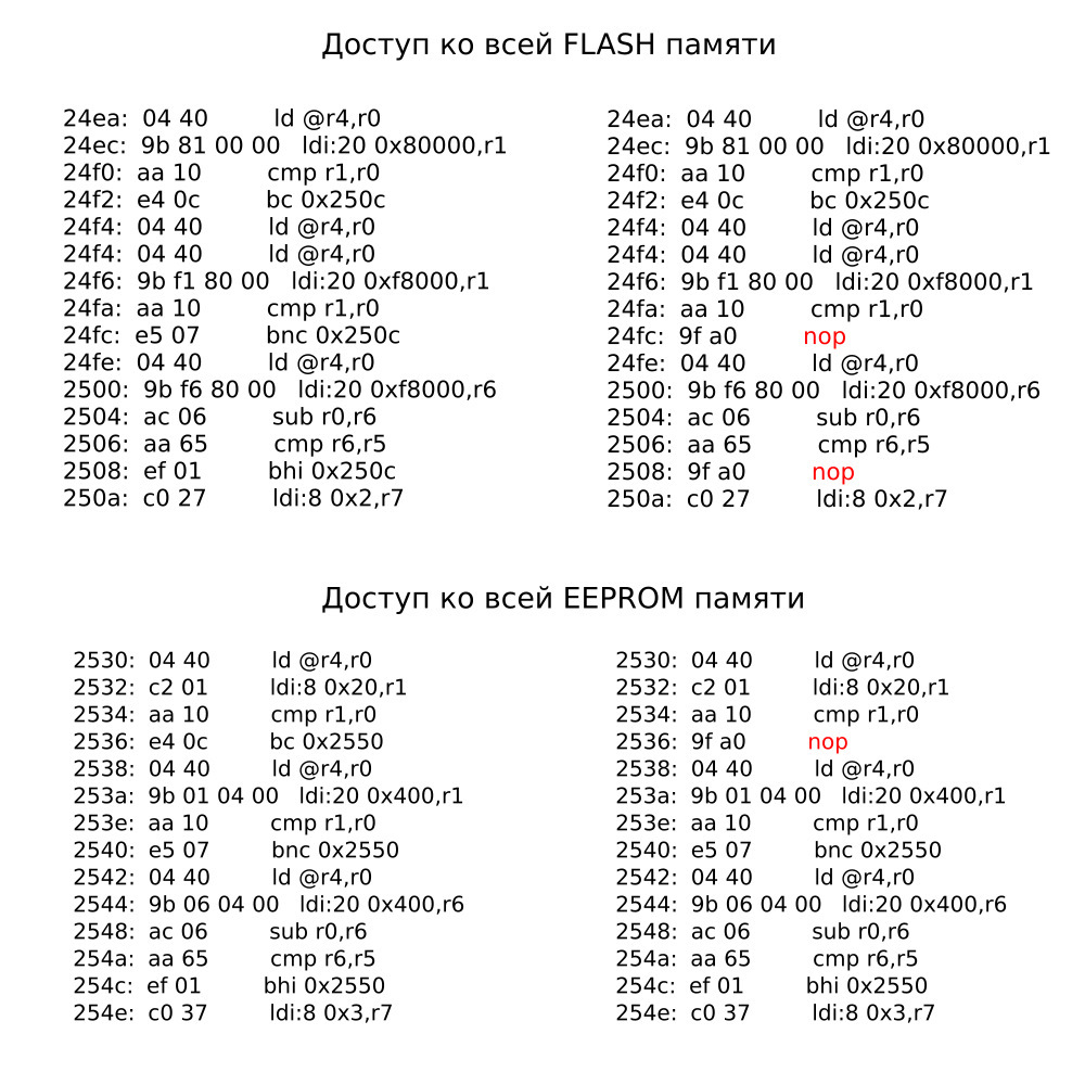 Инструкции отвечающие за проверку на адреса 0xf8000 и 0x20 я заменил на пустые операции NOP. На картинке ниже приведены правки которые необходимо сделать, чтобы получить полный доступ к flash-памяти и eeprom-памяти.