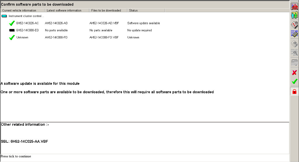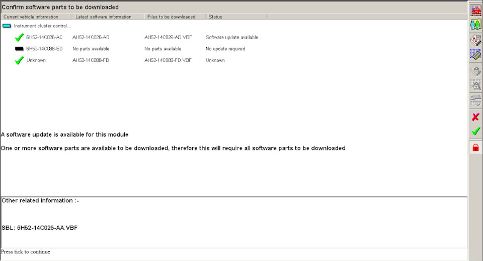 По нажатию на кнопку "#" можно было увидеть характеристики блоков автомобиля, в моем случае в приборной панели была видимо заводская прошивка 6H52-14C026-AC, для которой я даже не смог найти соответствующий vbf файл в каталоге прошивок SDD.