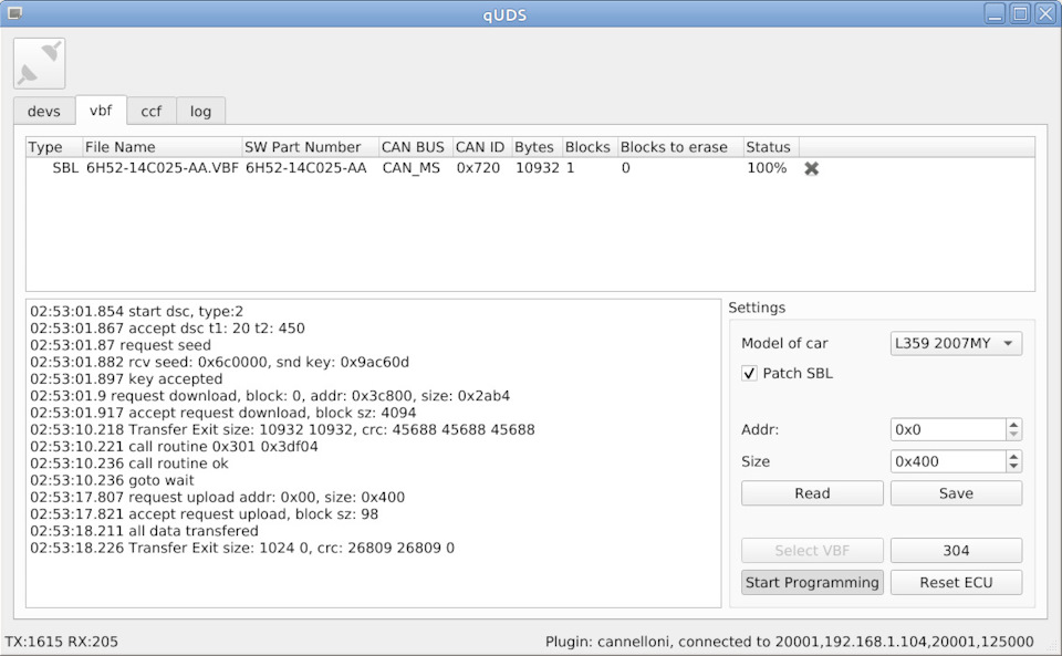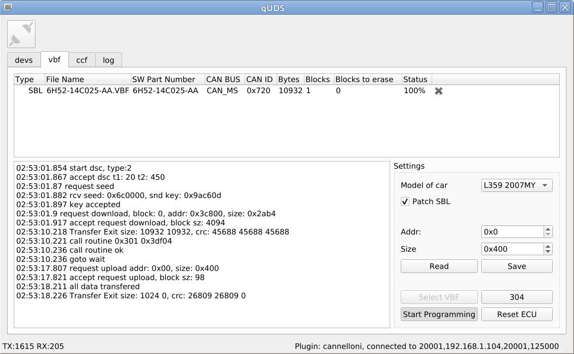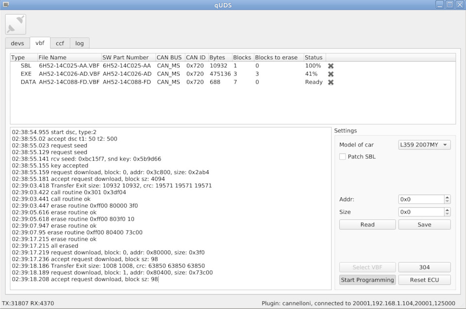 Но перед тем как перепрошивать приборную панель, с помощью своего vbf — загрузчика, я решил попытаться прочитать содержимое всей flash-памяти и epprom памяти с помощью SBL. Как я ранее уже озвучивал, SBL загруженный в ЭБУ дает возможность не только записывать новые данные в flash-память, так и считать текущие данные из памяти. В ходе опытов выяснилось, что SBL из файла 6H52-14C025-AA.VBF дает возможность прочитать не всю flash-память и eeprom-память.