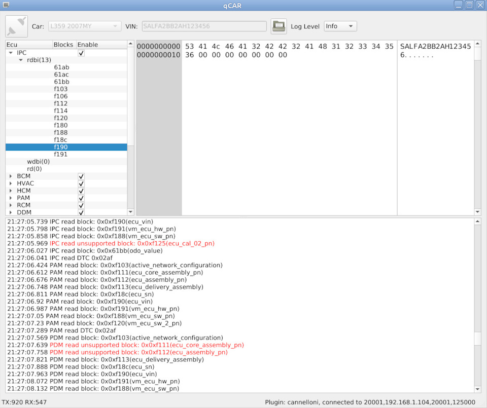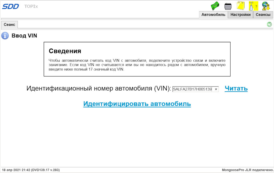 Первая проблемка с которой я столкнулся после запуска SDD это то, что в процессе автоматического считывания VIN номера, чтобы определить тип автомобиля, SDD пытается считать VIN номер, только из ограниченного числа блоков, и приборная панель не входит в этот список. Поэтому я задавал VIN номер вручную сначала от своего автомобиля, а уже потом от приборной панели которую перепрошивал.