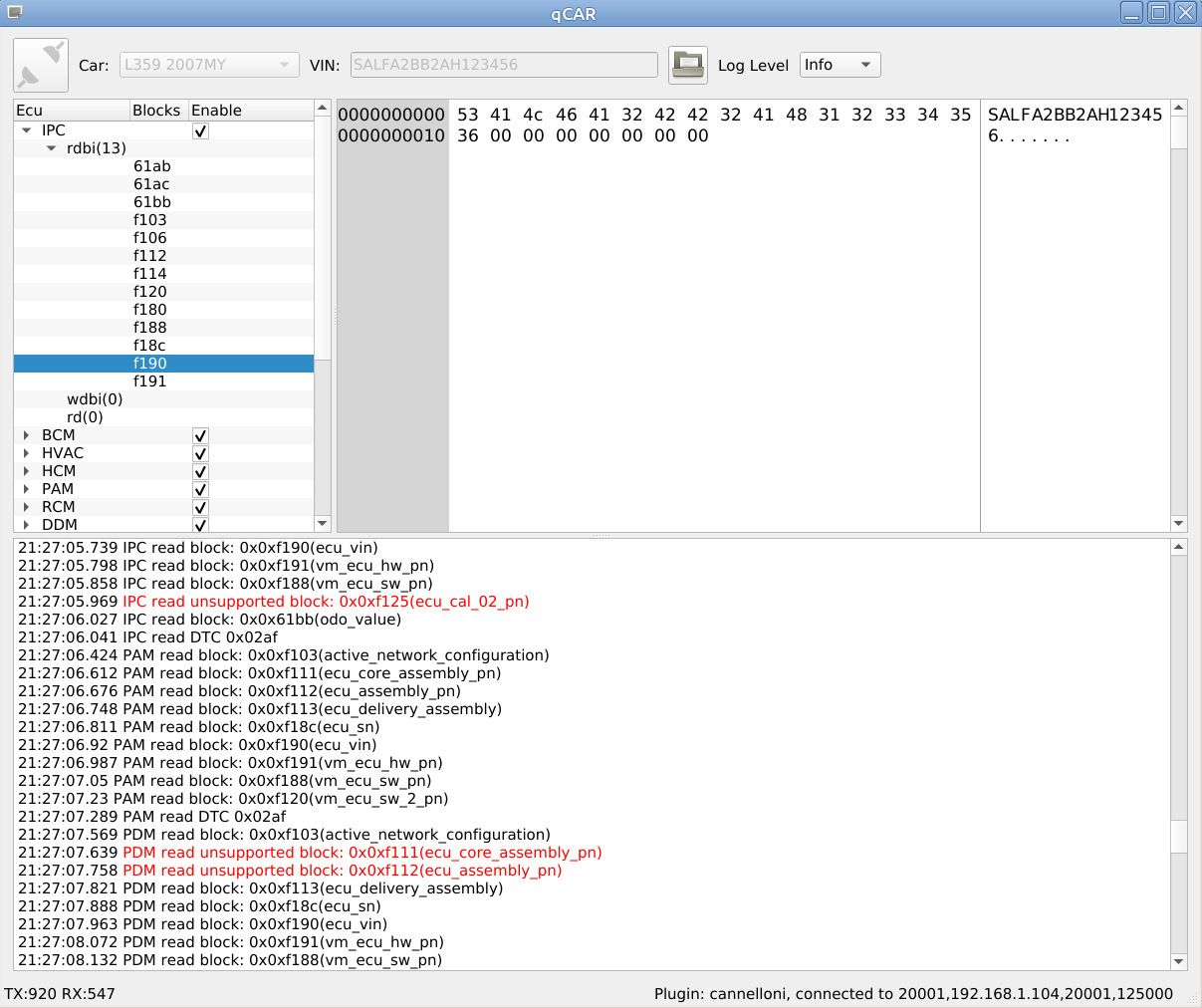 В журнале видны записи "read block" — это SDD запрашивает при сканировании блоков из ЭБУ блок данных по определенному идентификатору, есть ряд стандартизированных идентификаторов, например 0xf190 — VIN номер автомобиля, но большая часть специфичны для конкретной марки автомобиля.