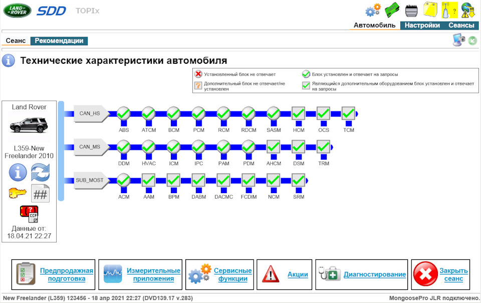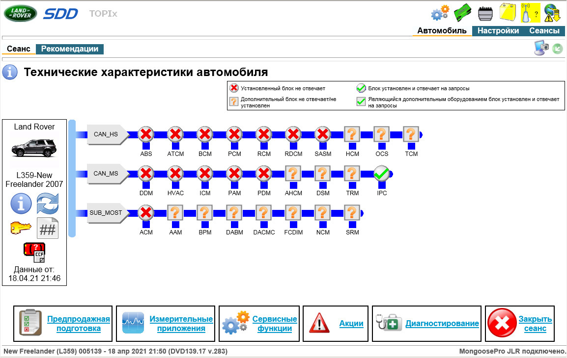 В конечном итоге, SDD завершив процедуру сканирования отображал состояние блоков автомобиля. В моем случае был активен только один блок автомобиля — это приборная панель(IPC).