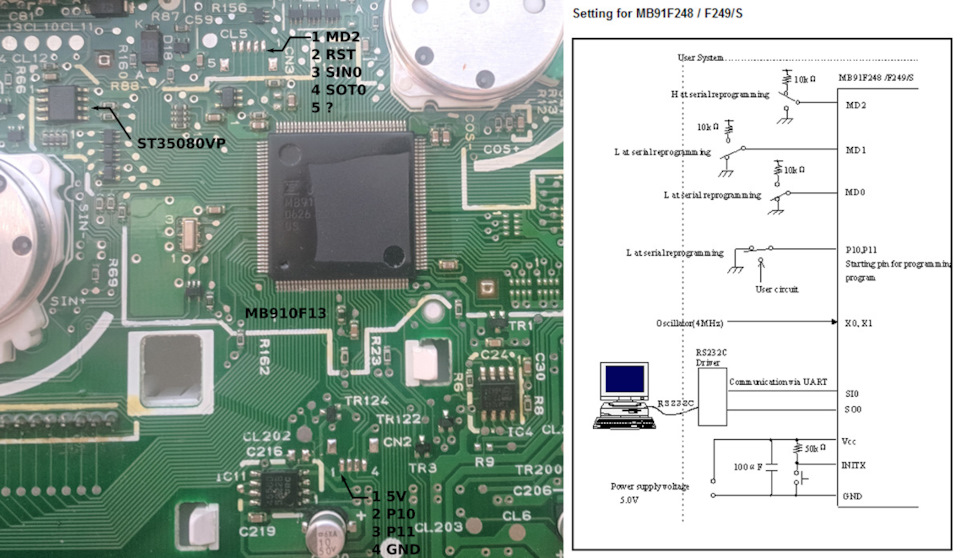 При таком подключении после включения питания микроконтроллер MB91F013 переходит в режим программирования через последовательный порт. Для загрузки прошивки в MB91F013 надо установить программу из архива pcwfr-v01l28.zip, эта официальная программа для перепрограммирования процессоров серии FR от производителя этих процессоров FUJITSU поможет оживить не работающую приборную панель. Предварительно перед запуском программы надо добавить в файле Program Files/FUJITSU/FUJITSU FLASH MCU Programmer/FR/chipdef.ini недостающее описание для микроконтроллера MB91F013.