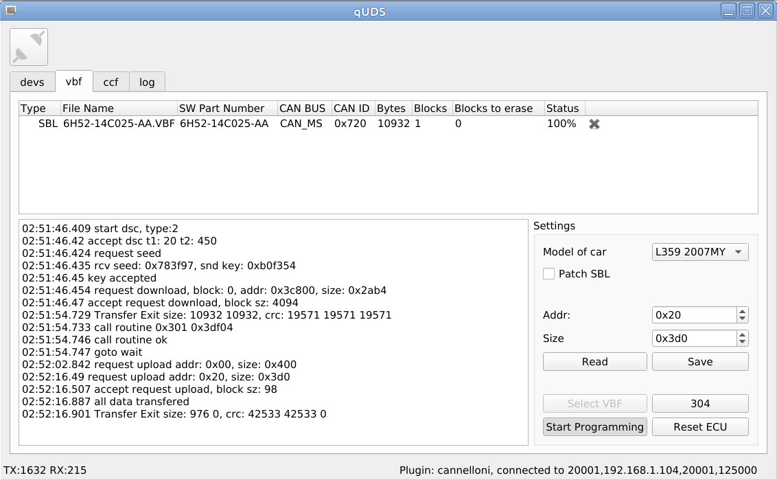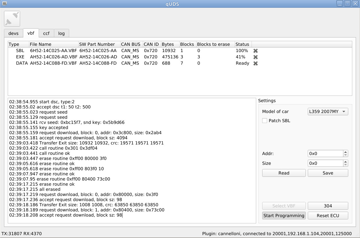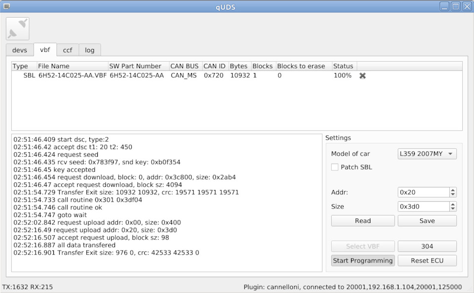 А если владельцам автомобилей Ford эта программа чем-то покажется знакомой, то вам не показалось, расположение элементов взято из vbf загрузчика программы UCDS. Интерфейс программы прост — заполняем список vbf-файлов которые надо загрузить в ЭБУ и далее нажимаем кнопку "Start Programming", после этого ждем окончания процедуры программирования. Основное отличие своего vbf-загрузчика от SDD это необходимость точно знать, какие vbf-файлы нужны для прошивки, но не надо уговаривать SDD прошить определенный ЭБУ автомобиля.