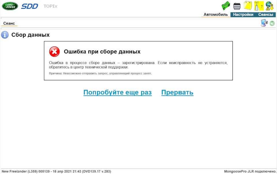 Далее при запуске процедуры "Идентифицировать автомобиль" и сканировании блоков автомобиля появлялись ошибки о занятии процесса SDD или о не соответсвии данных. Ошибки не критичные, но раздражающие, когда появляется такая ошибка надо подождать пару минут, пока фоновый процесс опроса блоков в SDD не завершит свою работу и "Попробовать еще раз".