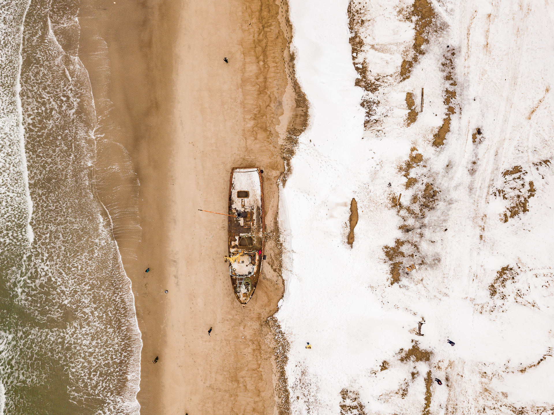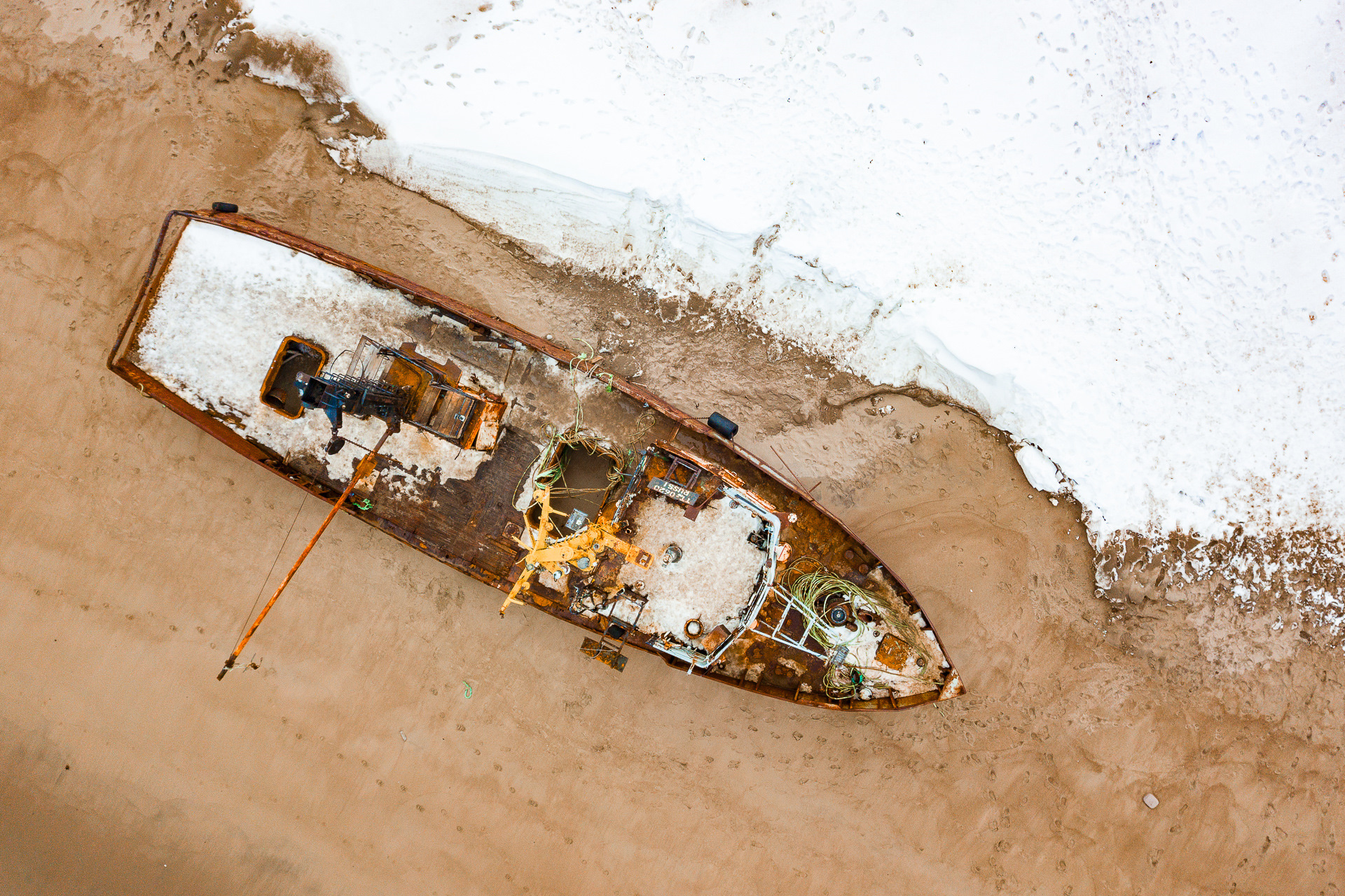 Дополню немного, правды ради: "но в итоге судно плотно застряло в песке в десятке метров от береговой линии." — на самом деле оно как раз на береговой линии стоит. В прилив волны бьют в борт этого судна.