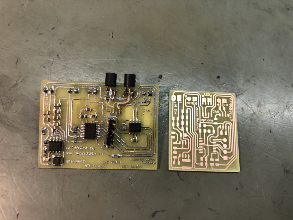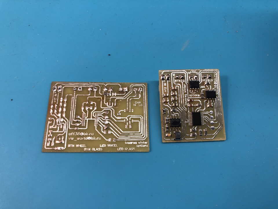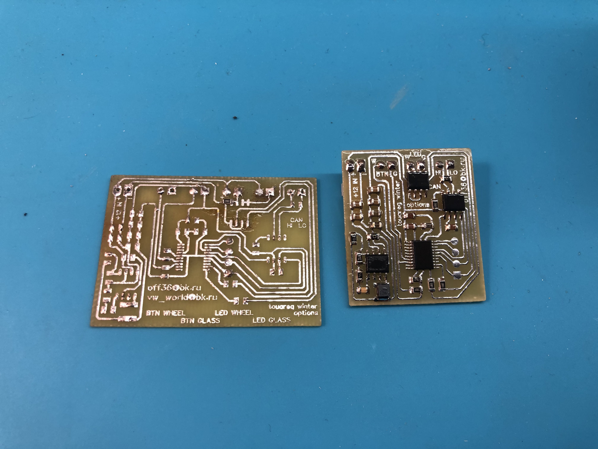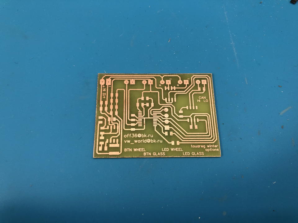 Далее собрал на столе макет. Алгоритм работы контроллера следующий: после старта контроллер слушает кан шину, если по шине летит посылка на включение обогрева руля или стекла сформированная с сенсорного экрана, контроллер зажигает соответствующий светодиод. Если происходит нажатие на физическую кнопку, в зависимости от состояния в котором находится обогрев он либо включается либо выключается. Диод так же синхронно включается или выключается, в зависимости от ситуации. В общем то как на туареге FL алгоритм. Пока магнитола грузится, кнопки уже работают))