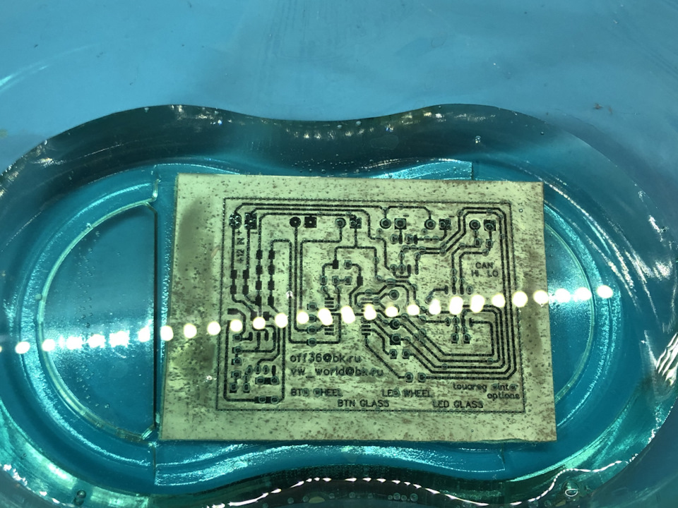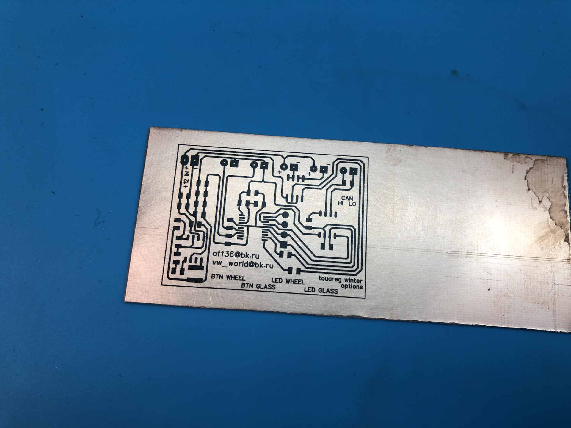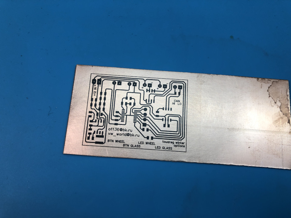 Платы я делаю следующим способом. За основу взят ЛУТ(лезерно утюжная технология), но вместо утюга я использую переделанный ламинатор. Плата распечатывается на термотрансфертной бумаге, затем прогоняется через ламинатор, тонер переходит на текстолит. Затем плата погружается в травилный раствор, вся медь не покрытая тонером растворяется.