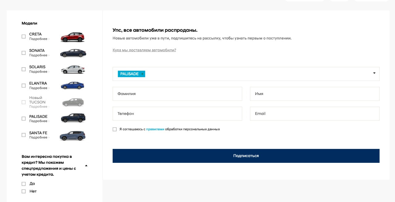 История такая. Запали на Hyundai Palisade, были на тест-драйве, все устроило, все покатались, выбрали комплектацию, открыли сайт Хендай. Для начала по твоему совету решили купить машину через онлайн-шоурум. Зарегистрировался на сайте, на сайте, в разделе авто нет ни одного в наличии. Подписался на Palisade, за несколько дней пришло одно уведомление, моментально перешел по ссылке, авто нет в наличии. Сидел, обновлял страницу, пока меня не забанили как "робота".
