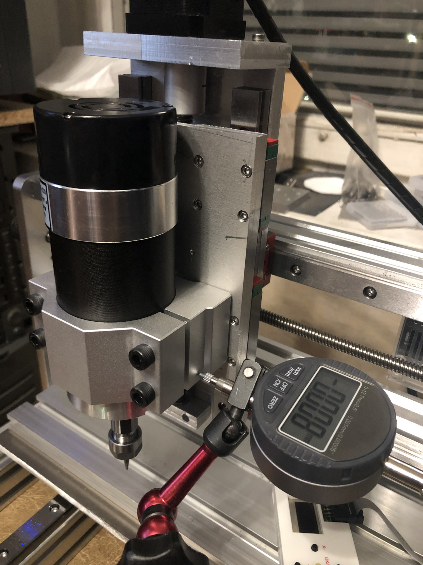 Первое, что бесило, это вылет шпинделя, с которого все проблемы и идут. Свисает, создает момент. Если посадить новый двигатель, то придется добавить переходную пластину на 6-10мм, которая усугубит вылет. И если с вертикальными люфтами я почти справился, то горизонтальные никуда не делись.