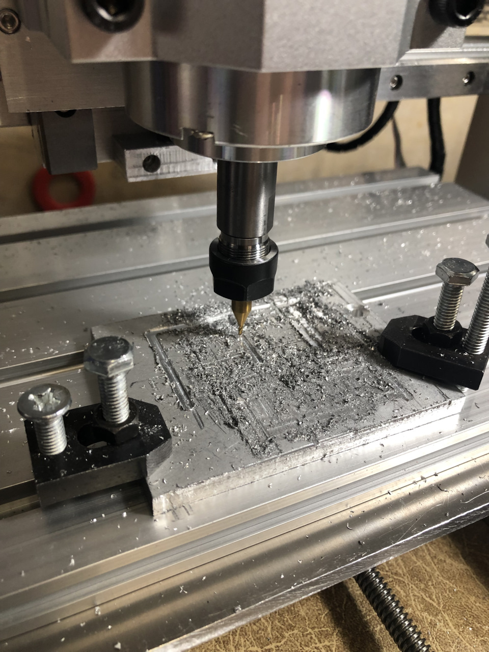А базе может пластик и некоторые породы дерева дырявить. После доработки, уже цветмет грызет небольшими съёмами. Такие раньше брали, чтобы платы печатные прорезать, вместо травления. По сути, функционал на уровне 3д принтера. Только тот печатает, а CNC 3018 дырявит.