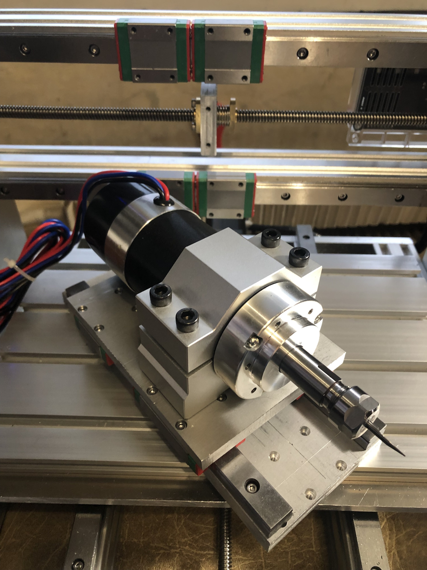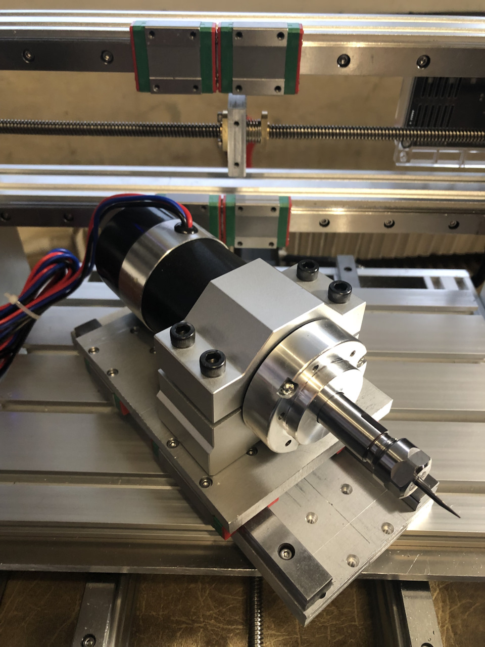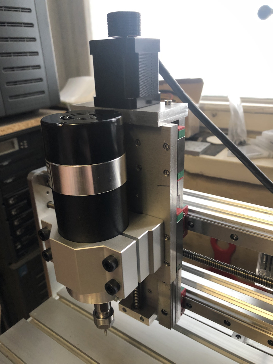 Навеяло рассказами умельцев, у которых моторчики не влезали и мешали шпинделю или его крыльчатке. Я пока собирал всю конструкцию, пальцы скрещивал, чтобы так не получилось. Тут сыграла высота рельс MGN15, толщина пластины кареток и немного везения. Если бы не повезло, то я бы просто опустил шпиндель на 20мм ниже и решил бы проблему.