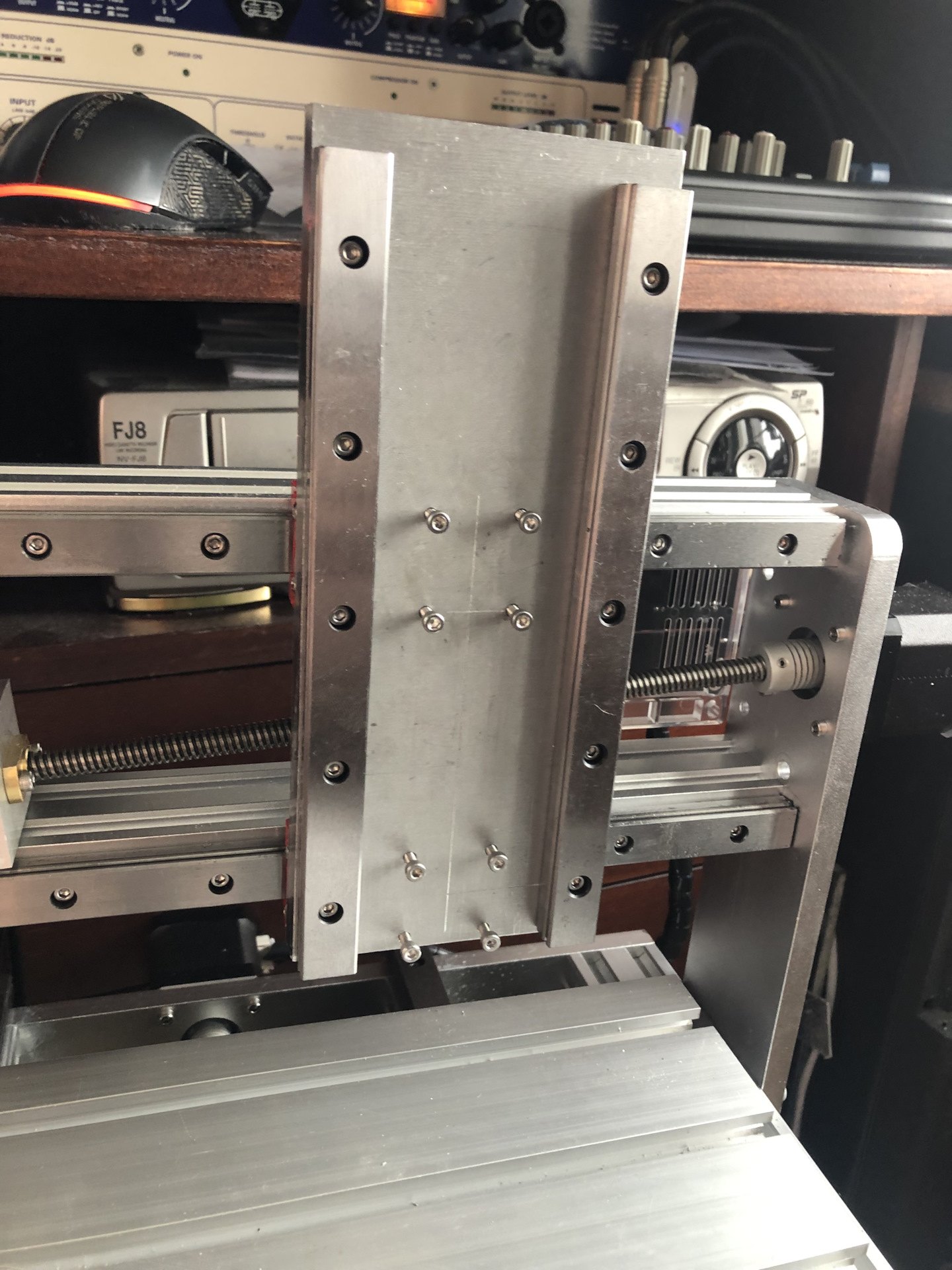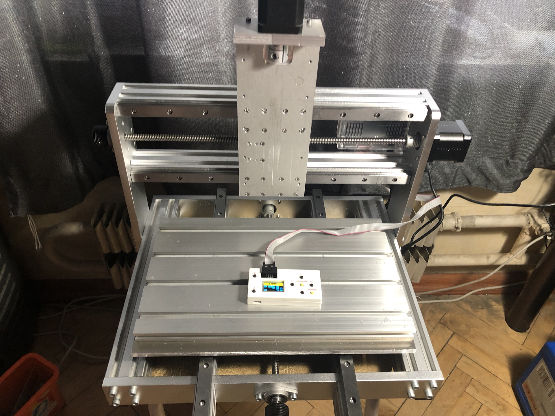 И больше всего бы мне сейчас хотелось попробовать станочек в деле, но увы. Для этого необходимо подключать моторчик к драйверу и новому блоку питания. А я пока этого так и не сделал, потому что дико задолбался пилить алюминиевые пластины для оси Z.