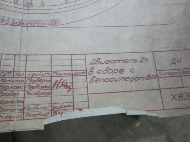 Есть и чертеж мотовелосипеда ХВЗ В-110 «Прогресс» с двигателем Д-4, на котором фамилия Прибылого значится в графе «Согласовал». То есть ведущий конструктор, согласовывал эти чертежи не только с главным конструктором, но и … с мастером экспериментального цеха Прибылым. Вот этот документ.