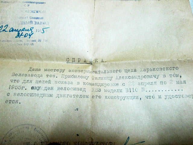 А вот эту справку, найденную при сносе экспериментального цеха ХВЗ, обнародовал исследователь истории Д4 Олег Мокиенко. Из нее мы четко видим, что в 1955 году Прибылому выдали велосипед с двигателем ЕГО КОНСТРУКЦИИ для демонстрации в командировке.